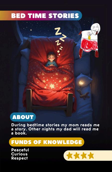 During bedtime stories my mom reads me a story. Other nights my dad will read me a book.