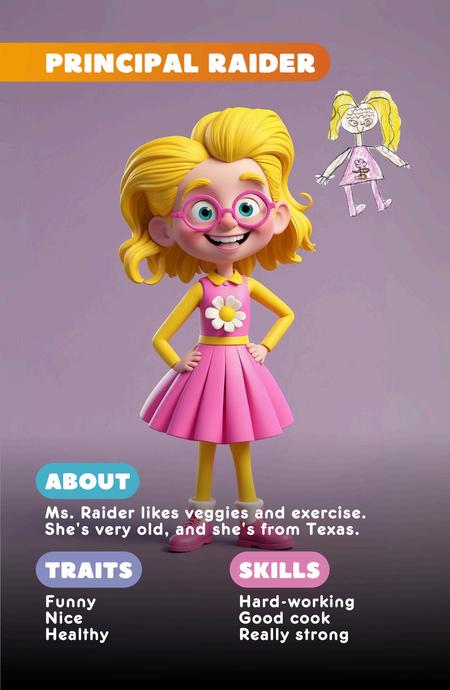 Ms. Raider likes veggies and exercise. She's very old, and she's from Texas.