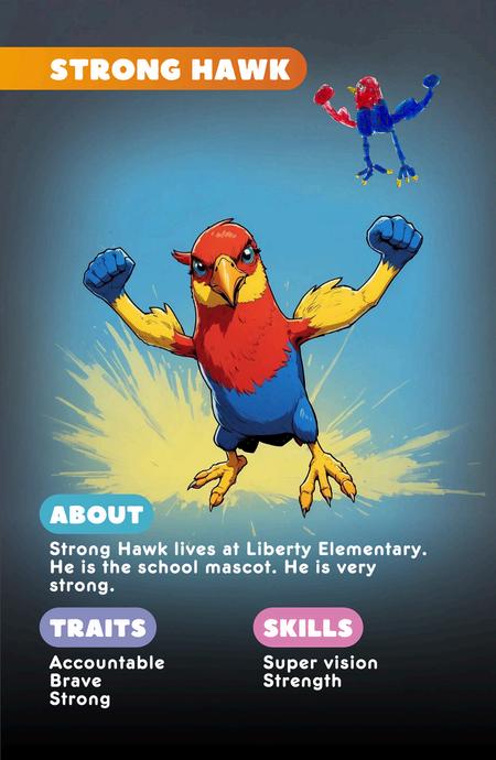 Strong Hawk lives at Liberty Elementary. He is the school mascot. He is very strong.
