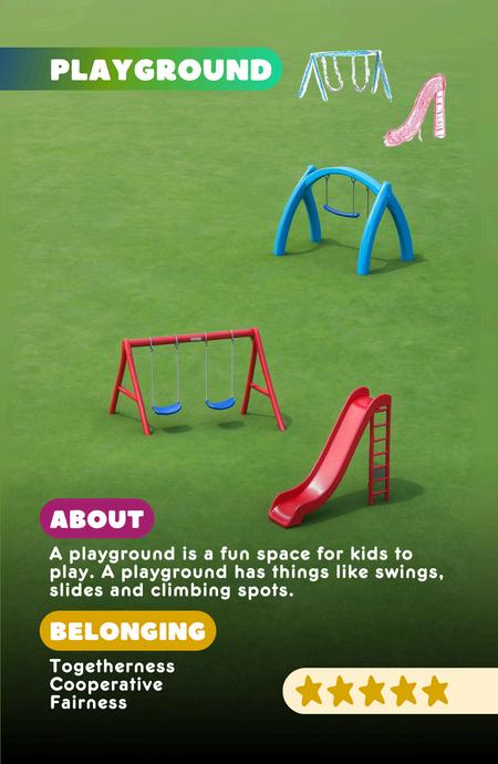 A playground is a fun space for kids to play. A playground has things like swings, slides and climbing spots.