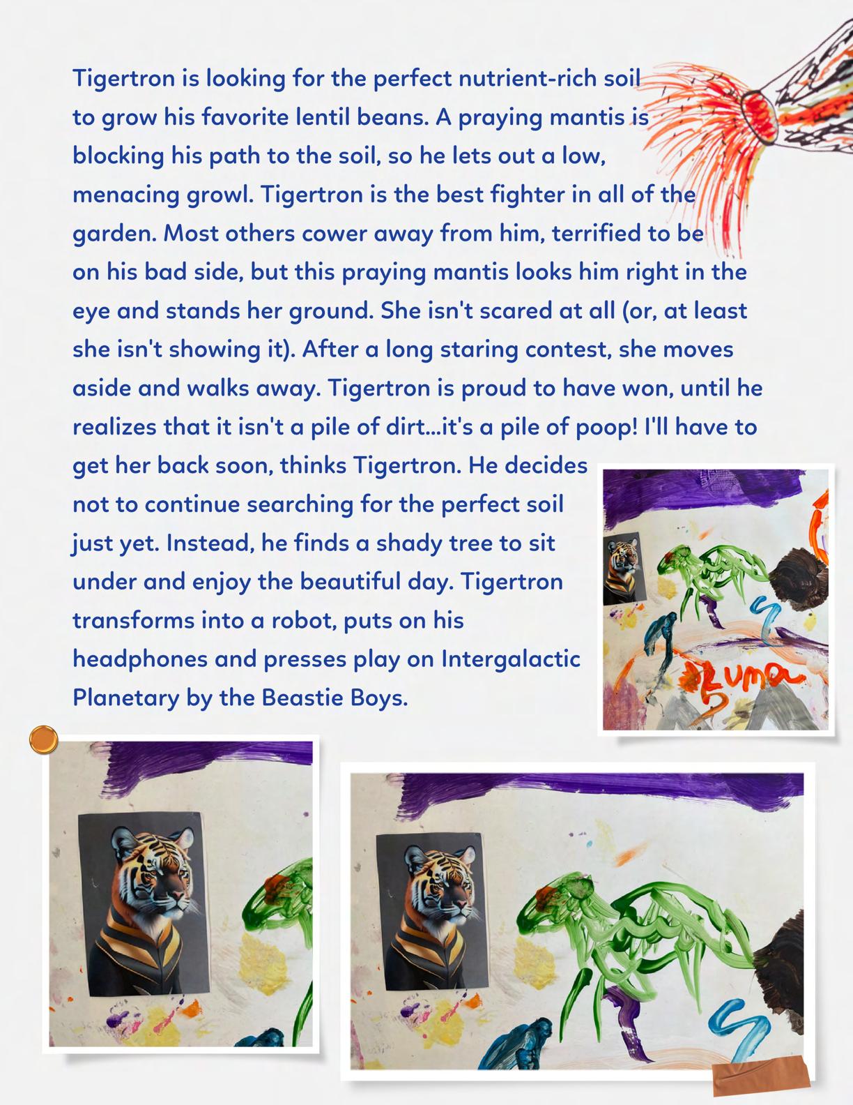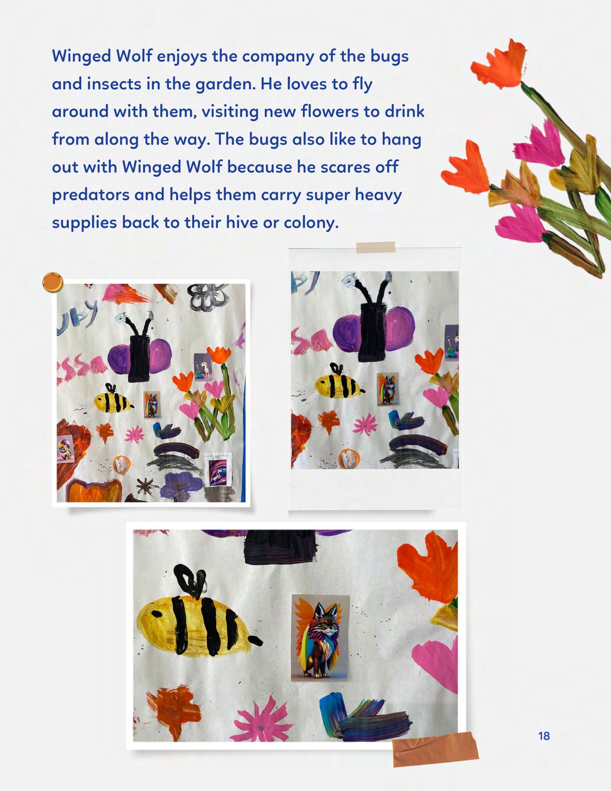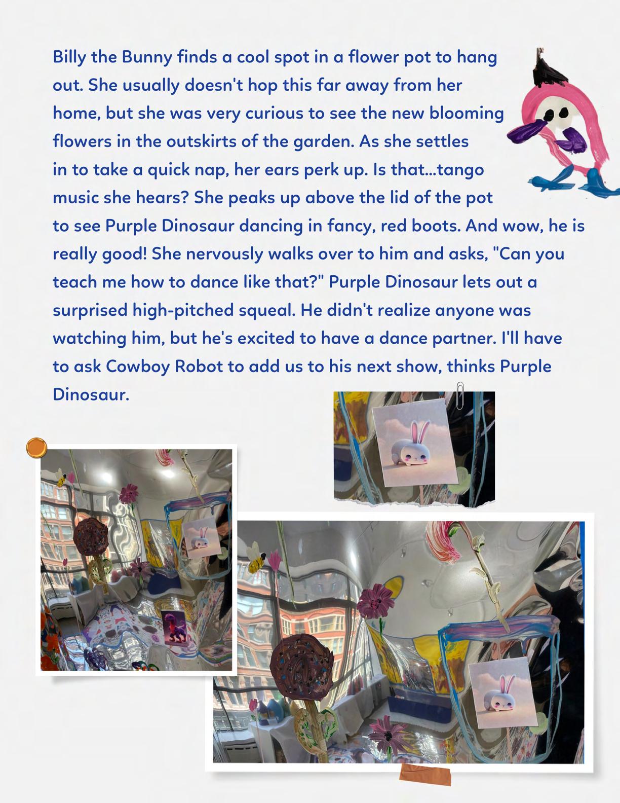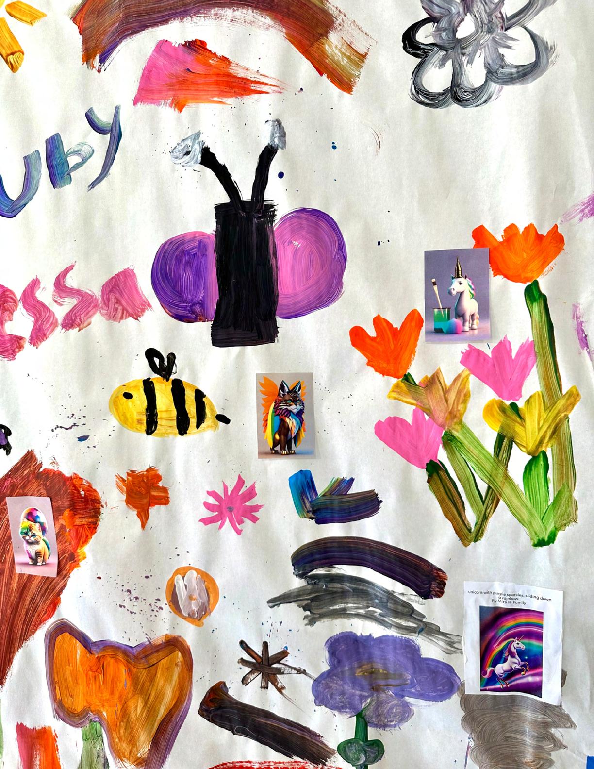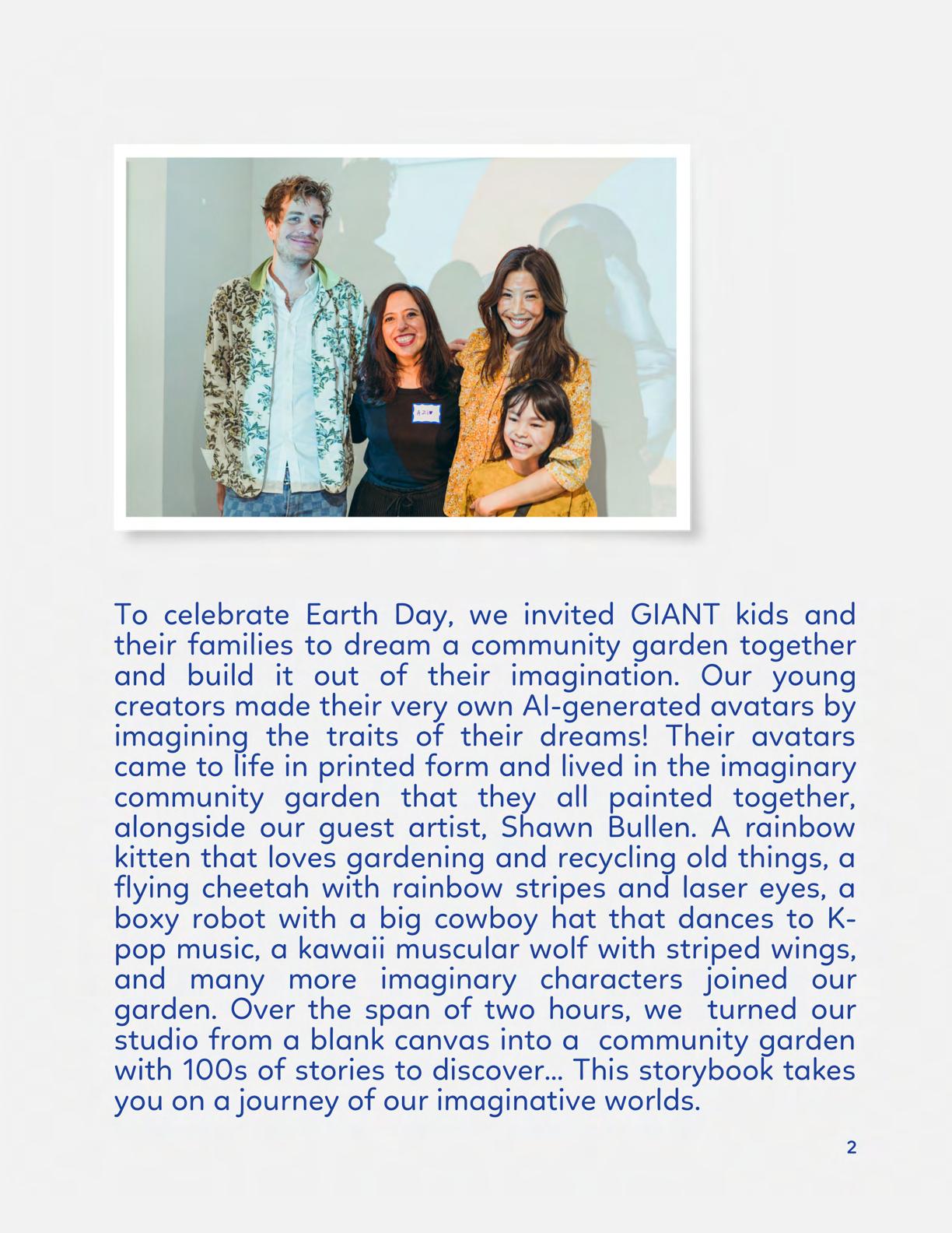 To celebrate Earth Day, we invited GIANT kids and their families to dream a community garden together and build it out of their imagination. Our young creators made their very own AI-generated avatars by imagining the traits of their dreams! Their avatars came to life in printed form and lived in the imaginary community garden that they all painted together, alongside our guest artist, Shawn Bullen. A rainbow kitten that loves gardening and recycling old things, a flying cheetah with rainbow stripes and laser eyes, a boxy robot with a big cowboy hat that dances to K-pop music, a kawaii muscular wolf with striped wings, and many more imaginary characters joined our garden. Over the span of two hours, we turned our studio from a blank canvas into a community garden with 100s of stories to discover... This storybook takes you on a journey of our imaginative worlds.