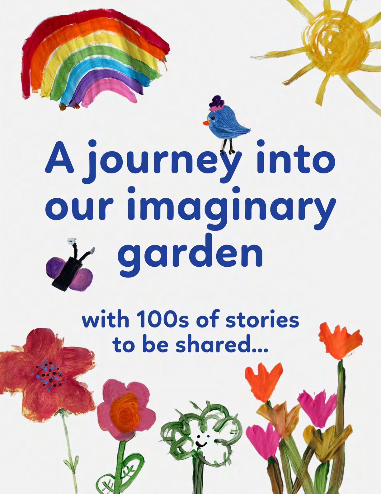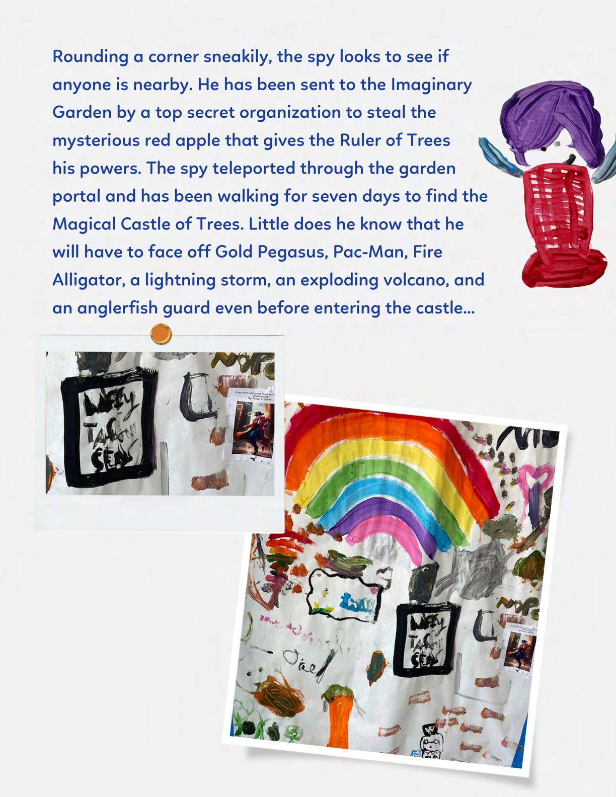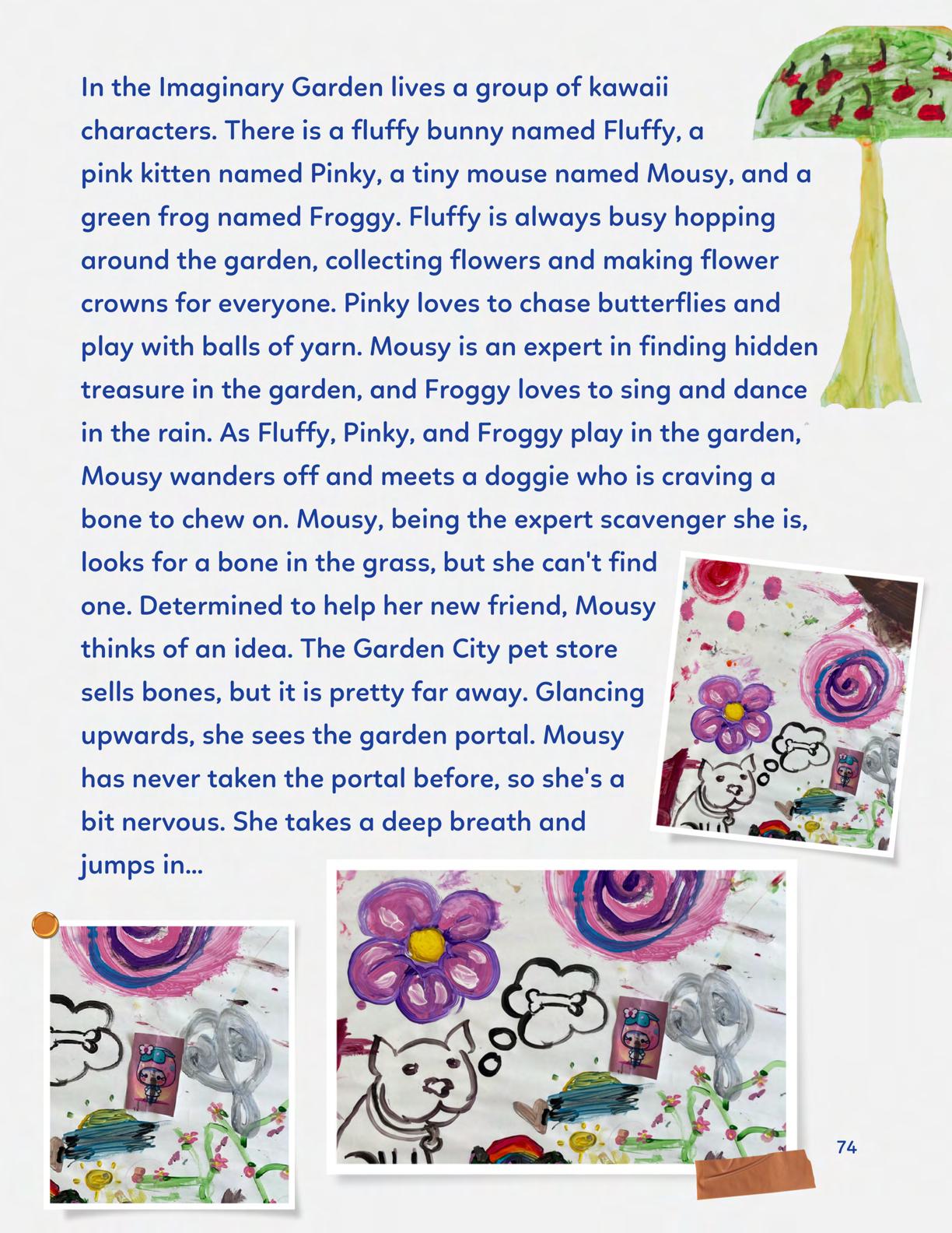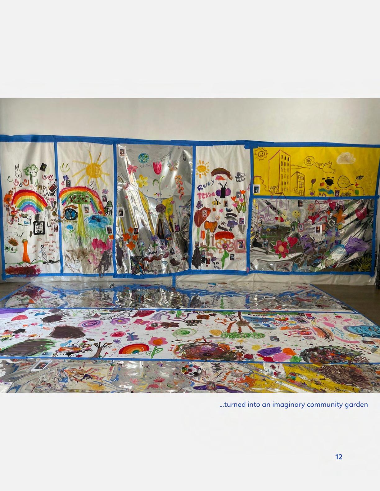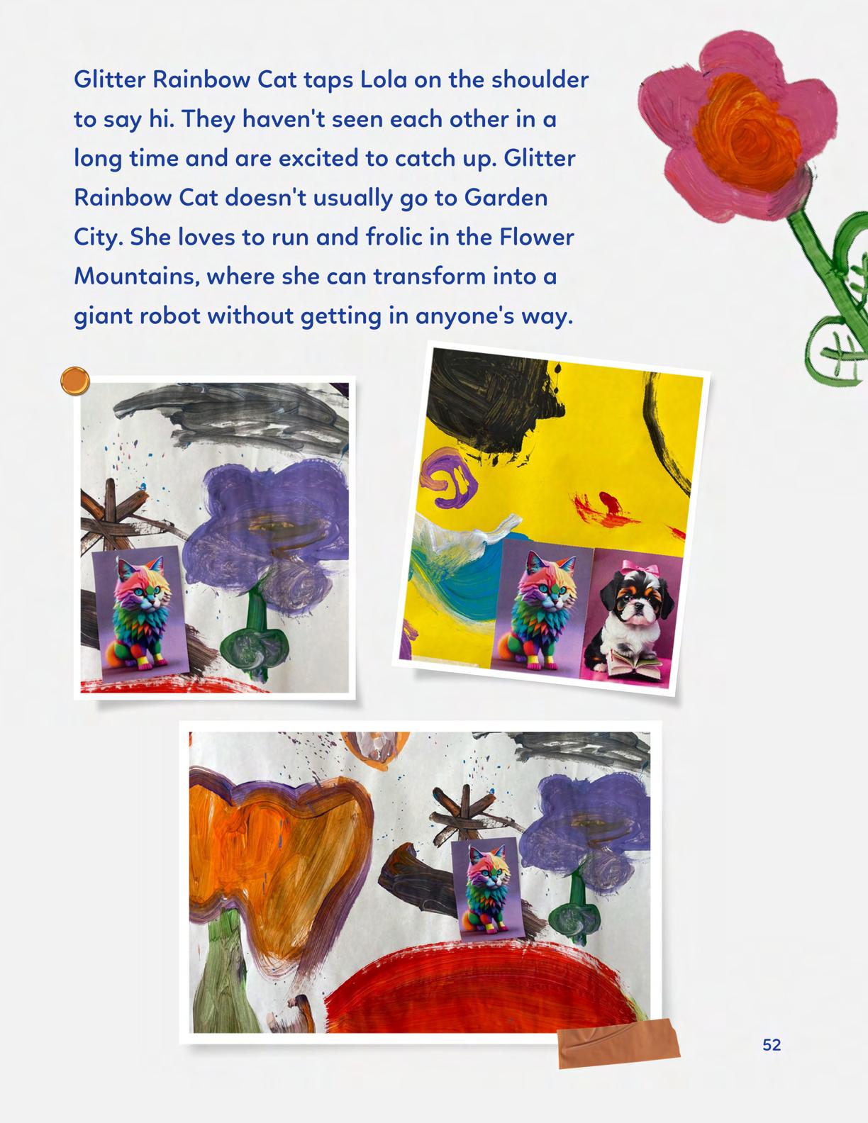 To celebrate Earth Day, we invited GIANT kids and their families to dream a community garden together and build it out of their imagination. Our young creators made their very own AI-generated avatars by imagining the traits of their dreams! Their avatars came to life in printed form and lived in the imaginary community garden that they all painted together, alongside our guest artist, Shawn Bullen. A rainbow kitten that loves gardening and recycling old things, a flying cheetah with rainbow stripes and laser eyes, a boxy robot with a big cowboy hat that dances to K-pop music, a kawaii muscular wolf with striped wings, and many more imaginary characters joined our garden. Over the span of two hours, we turned our studio from a blank canvas into a community garden with 100s of stories to discover... This storybook takes you on a journey of our imaginative worlds.