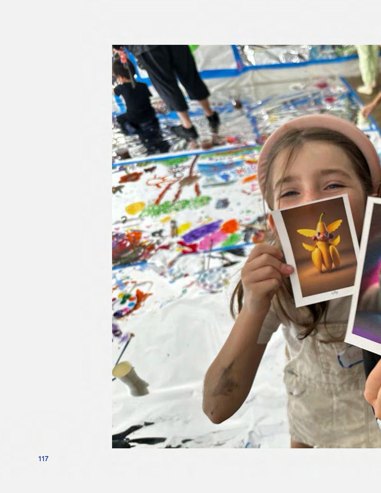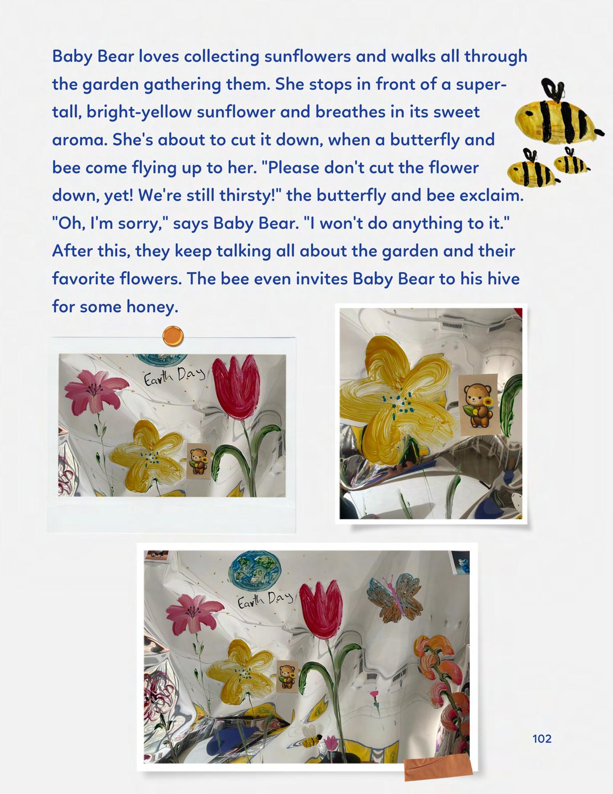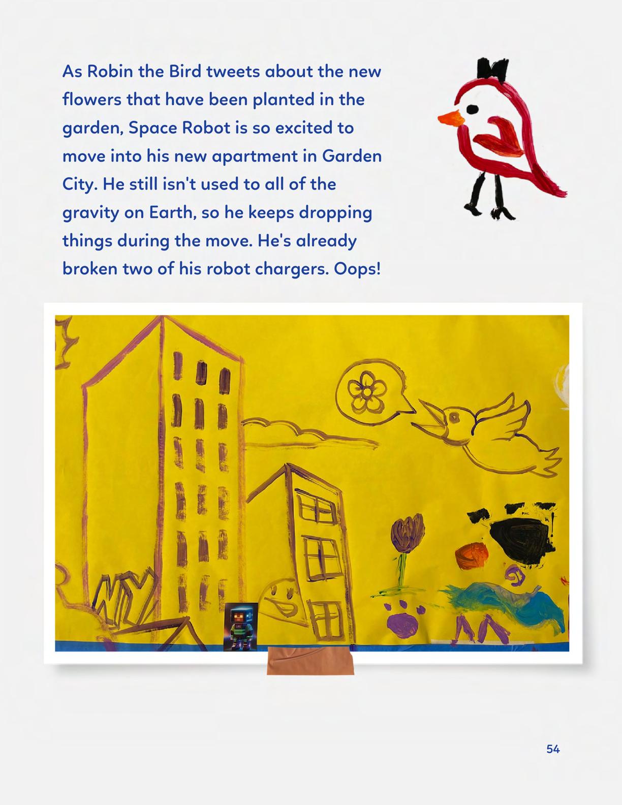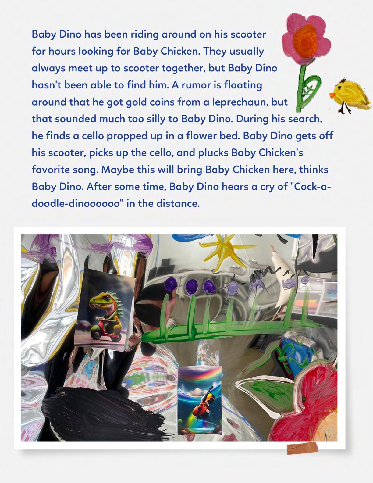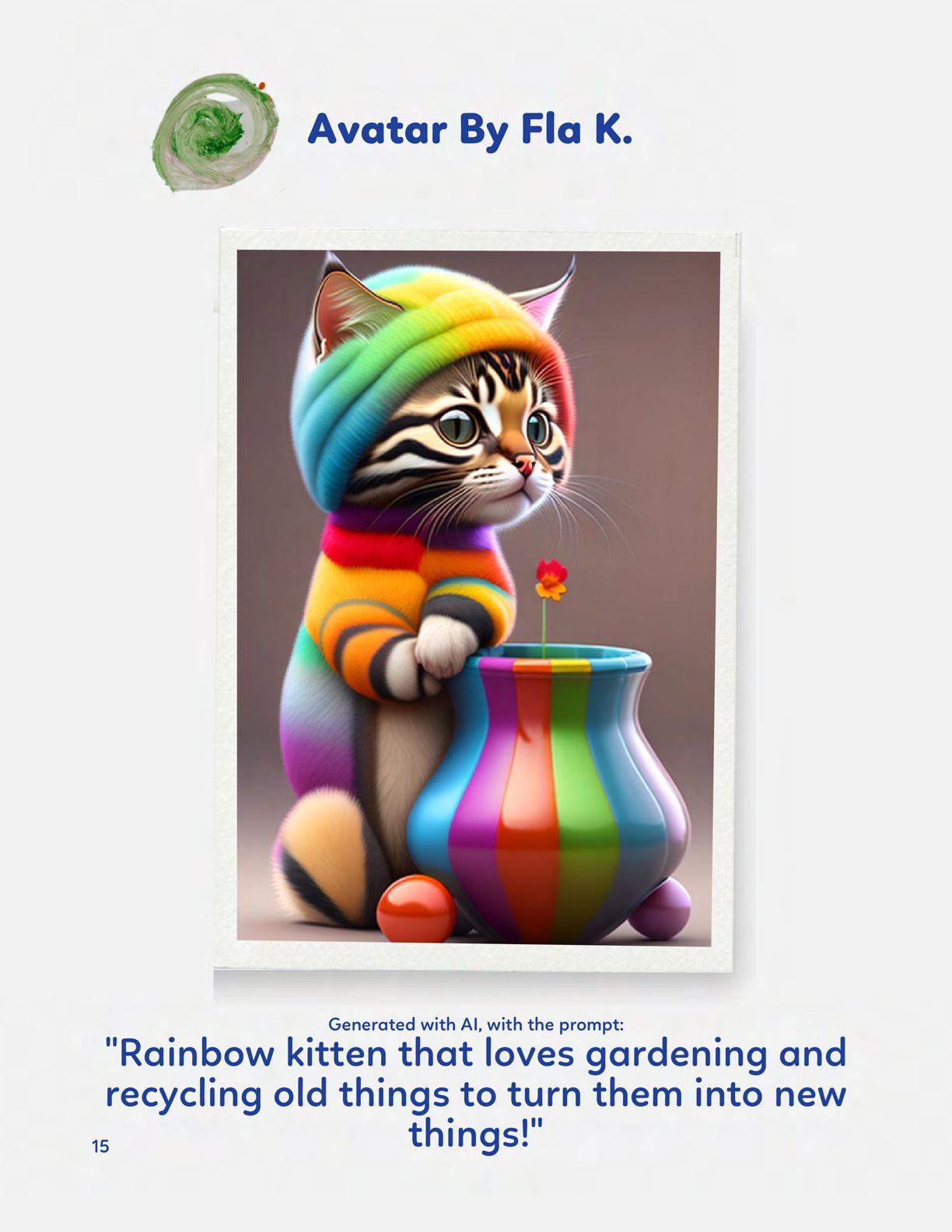To celebrate Earth Day, we invited GIANT kids and their families to dream a community garden together and build it out of their imagination. Our young creators made their very own AI-generated avatars by imagining the traits of their dreams! Their avatars came to life in printed form and lived in the imaginary community garden that they all painted together, alongside our guest artist, Shawn Bullen. A rainbow kitten that loves gardening and recycling old things, a flying cheetah with rainbow stripes and laser eyes, a boxy robot with a big cowboy hat that dances to K-pop music, a kawaii muscular wolf with striped wings, and many more imaginary characters joined our garden. Over the span of two hours, we turned our studio from a blank canvas into a community garden with 100s of stories to discover... This storybook takes you on a journey of our imaginative worlds.