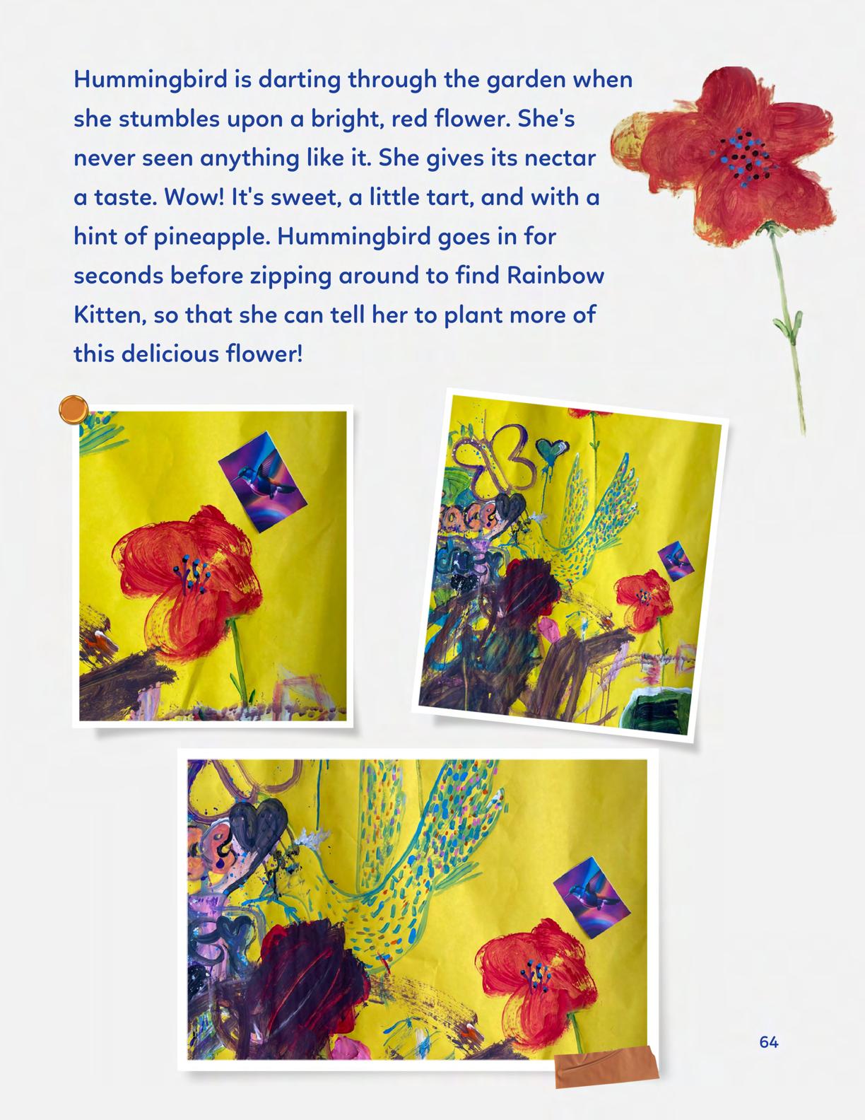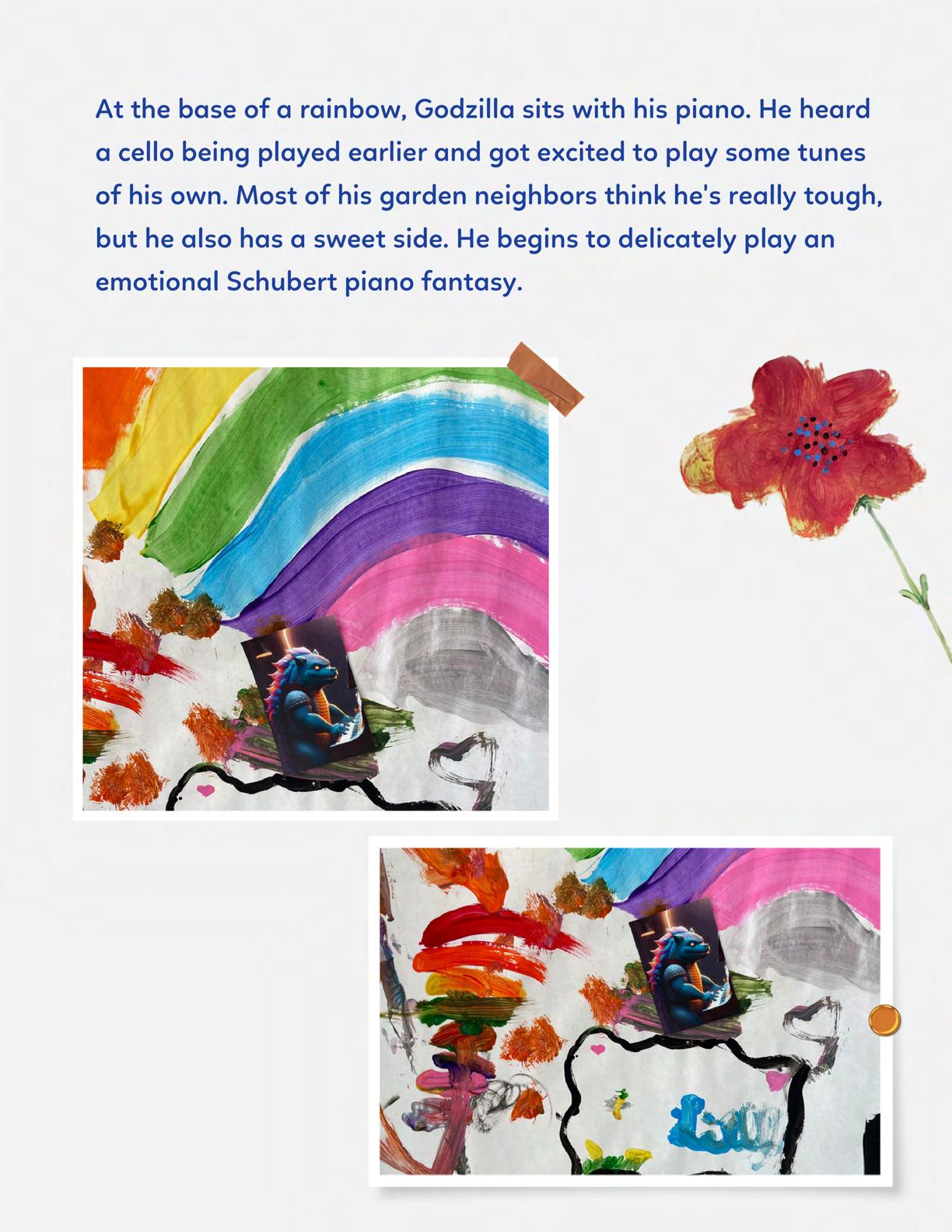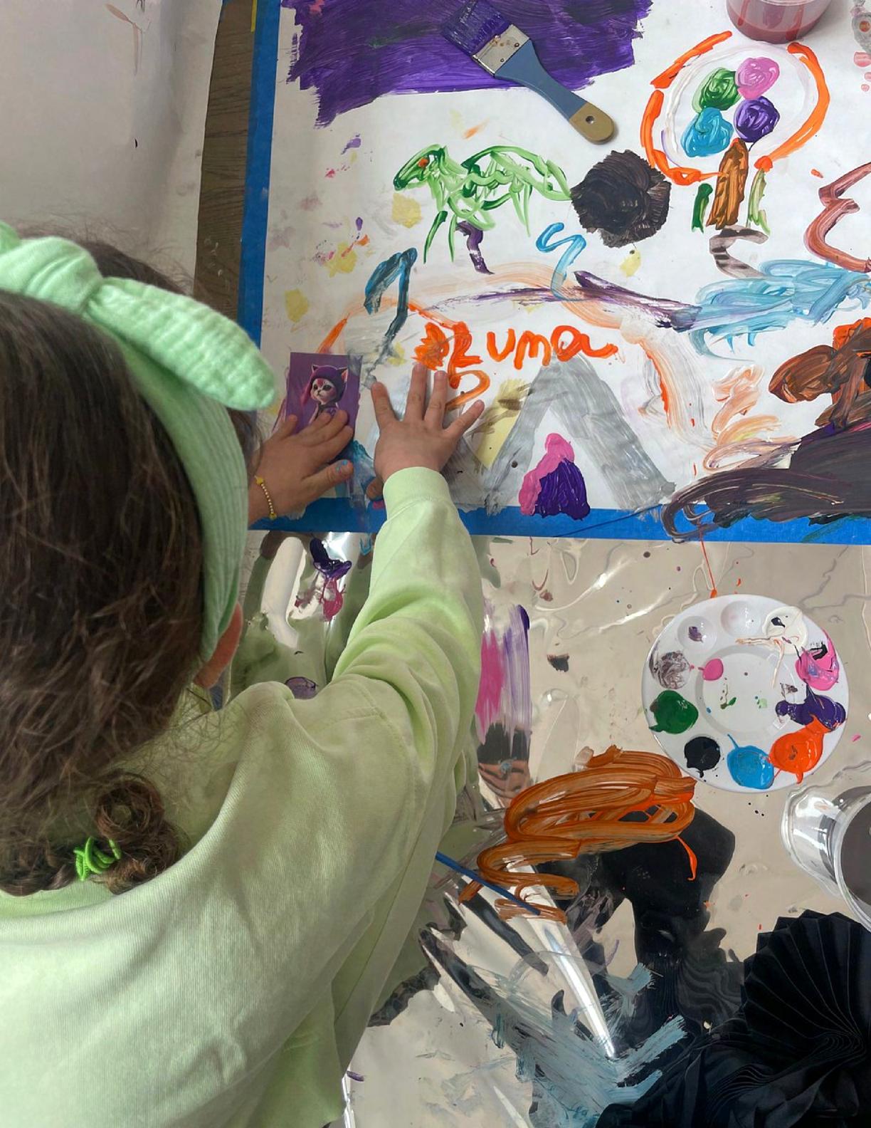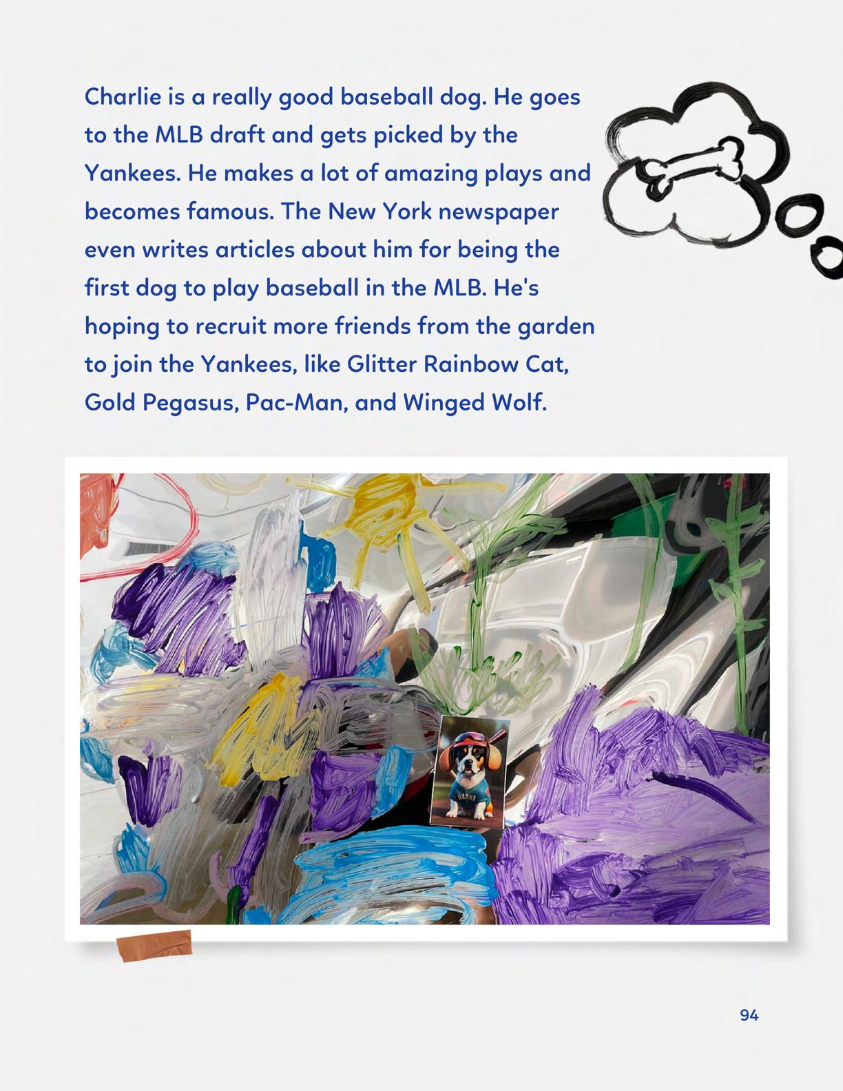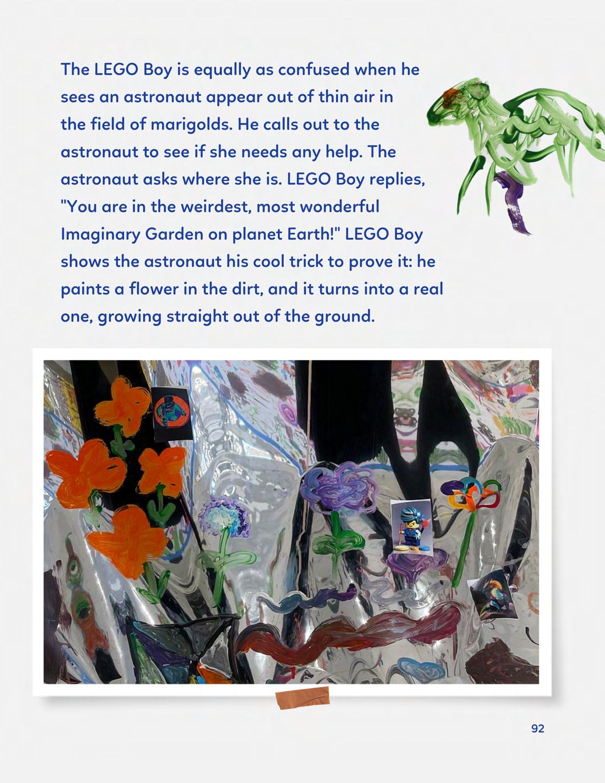 To celebrate Earth Day, we invited GIANT kids and their families to dream a community garden together and build it out of their imagination. Our young creators made their very own AI-generated avatars by imagining the traits of their dreams! Their avatars came to life in printed form and lived in the imaginary community garden that they all painted together, alongside our guest artist, Shawn Bullen. A rainbow kitten that loves gardening and recycling old things, a flying cheetah with rainbow stripes and laser eyes, a boxy robot with a big cowboy hat that dances to K-pop music, a kawaii muscular wolf with striped wings, and many more imaginary characters joined our garden. Over the span of two hours, we turned our studio from a blank canvas into a community garden with 100s of stories to discover... This storybook takes you on a journey of our imaginative worlds.
