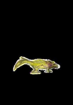 Can move on land and in water. Has a strong wolf-like bite but through a frog's head. Lives more in the water than on land. Does not stop pursuing its targets.