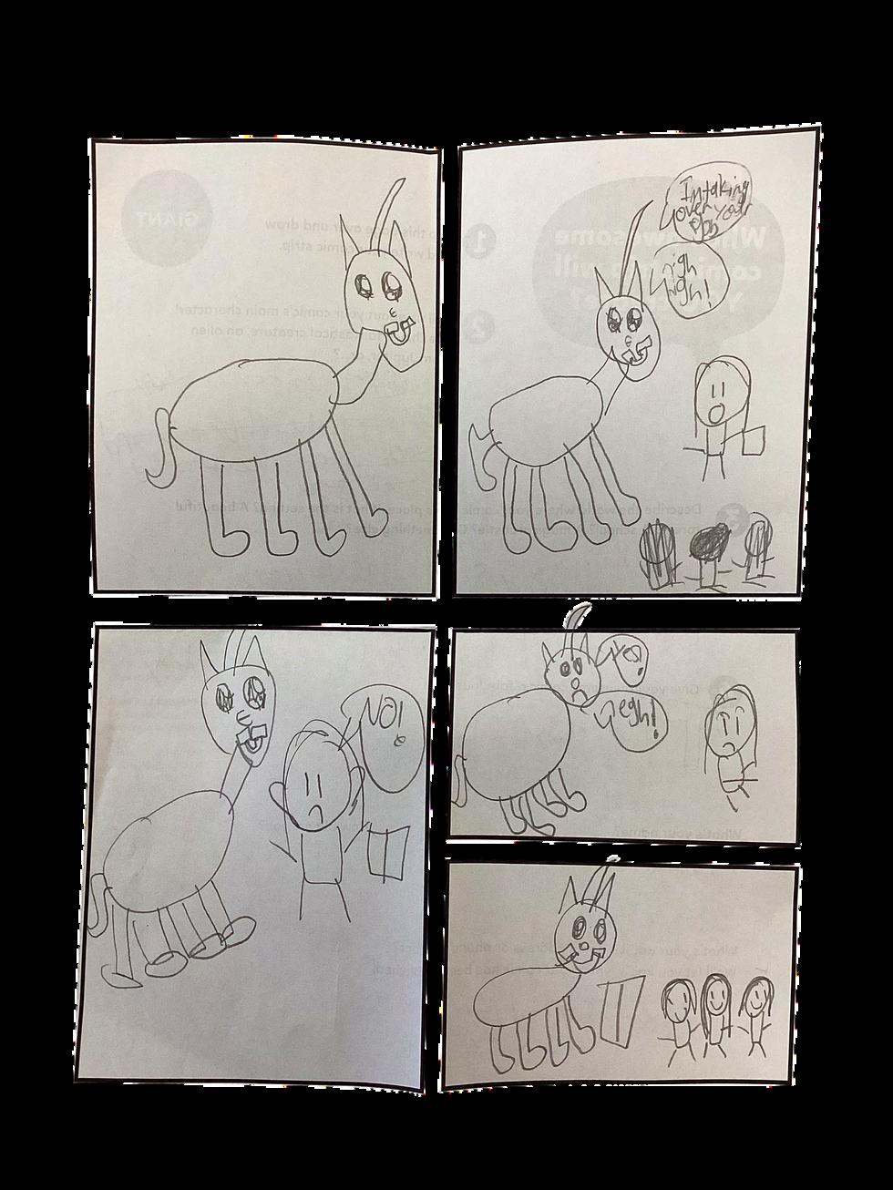 More than 45 participants joined, dreamed, created, and shared their stories and comic strips. Here, we have “remixed” their creations into one GIANT book of comics. Each comic has its own title page with the story’s title, the author’s name, and the author’s age. Using participants’ ideas, drawings, writings, and input, we created AI-generated avatars of the characters that appear in their story and an AI-generated background image as the setting for their story. There’s even a place for participants to add their official author signature!