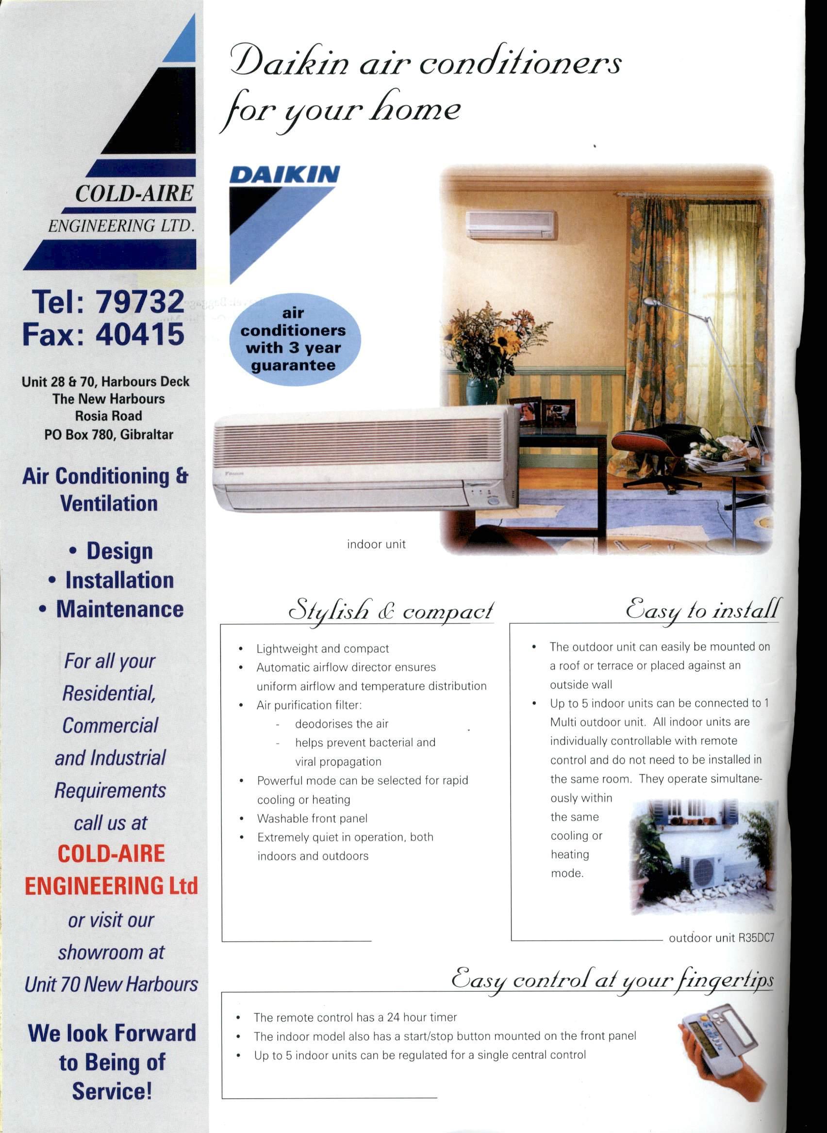 COLD-AIRE ENGINEERING LTD. Tel: 79732 Fax: 40415 Unit 28 £r 70, Harbours Deck The New Harbours Rosia Road PO Box 780, Gibraltar Air Conditioning & Ventilation • Design • Installation • Maintenance