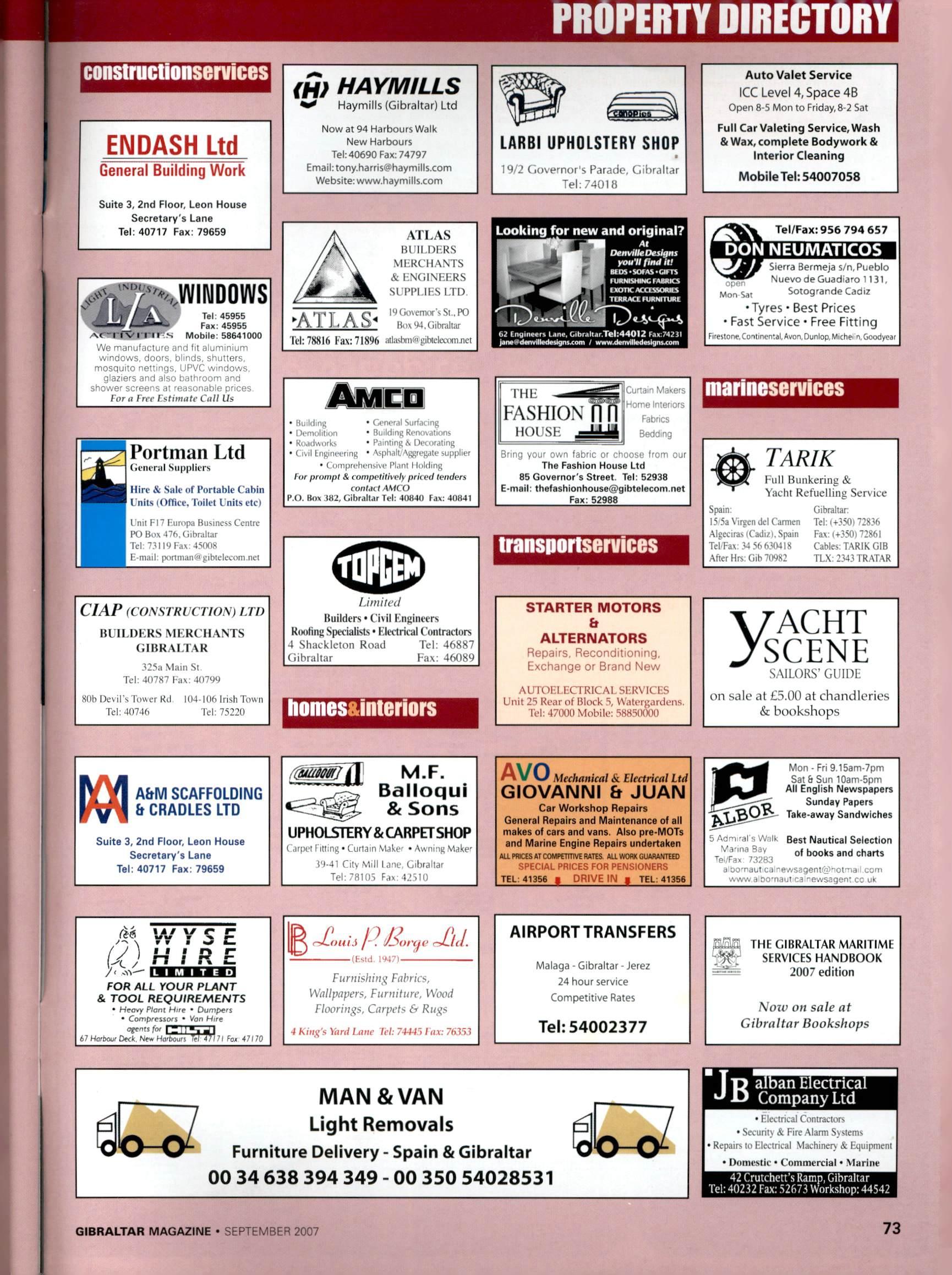 PROPERTY DIRECTORY EIMDASH Ltd General Building Work Suite 3, 2nd Floor, Leon House Secretary's Lane Tel: 40717 Fax: 79659 WINDOWS Tel: 45955 Fax: 45955 Mobile: 58641000 We manufacture and fit aluminium windows, doors, blinds, shutters, mosquito nettmgs, UPVC windows, glaziers and also bathroom and shower screens at reasonable prices For a Free Estimate Call Us Portman Ltd Gcncnil Suppliers Hire & ShIc of Portable Cabin Units(Office. Toilet Units etc) Unit FIT F-iinipa Business Centre PO Bos -176. Gibraltar Td: 731 19 Fax 45008 F-mail: portmanCa gibtelecoin.nut CIAP(CONSTRUCTION)LTD BUILDERS MERCHANTS GIBRALTAR 325a Main St Tel: 40787 Fax: 40799 HOb Devil's Tower Rd. Tel: 40746 104-106 Irish Town Tel: 75220 (HI HAYMILLS ^ Haymills(Gibrdltar) Ltd Now at 94 Harbours Walk New Harbours Tel:40690 Fax:74797 Email;tony,harrjs@>haymills,com Website:www.haymills.com ATLAS BUILDERS MERCHANTS & KNOINEERS SUPPLIES LTD. 19GovemorsSt-.PO Box 94.Gibraltar lei: 78816 Fax; 71896 mlasbniceibiclecnninet • iiuildmg • t4'(H-ral Surt.u ing • Oemulition • Building Renovations • Roadworks • Painting Decorating • Civil tngineering • Asphalt/'Aggregale supplier ■ Comprehensive Plant I iolding for prompt & compefifive/v priced lenders conljcl AMCO P.O. Bo* .IH'Z, Gibraltar Tel: 40H40 Fax: 40841 Limited Builders• Civil Engineers Rooting Specialists• Electrical Contractors 4 Shockleton Road Tel: 46887 (iihraltar Eax. 46080 iiomes&iiiterlors LARBI UPHOLSTERY SHOP (iovernor's Parade, Gifir.iltar Tel: 7401 8 T(i Looking for new and original? DuivmOtslgMS vovHTuttlM M06*SOrAS-aFTS 62 EnglnMrt Ijnc,Cibraiur.Tei!440l2 Fax:7423l jtnaedwMilliiliilyiiitoin / www.diiwIBidtilaniiWun CLjIriin M.ikprs .t^riors FASHION n FdbriCb HOUSE Bedding Bring your own fabric or choose from our The Fashion House Ltd 85 Governor's Street, Tel: 52938 E-mail: thefashionhouse@gibtelecom,net Fax: 52988 transportservlces STARTER MOTORS £r ALTERNATORS Repairs. Reconaitionmg, Exchange or Brand New AUTOFI.nCTRICAl.SLKVlCFS Unit 25 Rear of Block 5, W.UiTgJidens. ■fel: 47000 Mobile: 58850000 Auto Valet Service ICC Level 4, Space 4B Open 8-5 Mon to Friday, 8-2 Sat Full Car Valeting Service, Wash & Wax, complete Bodywork & Interior Cleaning Mobile Tel: 54007058 Tel/Fax: 956 794 657 DON NEUMATICOS 9/1f Sierra Sermeja s/n,Pueblo NuevodeGuadiaro 1131. Mor^ Sat Sotogrande Cadiz •Tyres • Best Prices * Fast Service • Free Fitting Firestone,Continental,Avon, Dunlop.Mic^lel■^Go^)dye^^ marineservices TAR/K Spain, 15 5a Vifgcn del Carmen .Aieecins (Cadi/). Spain TefPa.* 34 56 6.MMI8 .After Hrs; Gib 70982 Full Bunkering & Yachi Refuelling Service Gibraltar Tel: (-f'SO) 72836 Fax: 1-^350)72861 Cables: TARIK GIB TLX: 2.^43 TR,-\T,AR ACHT SCENE SAILORS'GUIDE on sale at £5.00 at chandleries t&t bookshops Ys m ACrM SCAFFOLDING £r CRADLES LTD Suite 3, 2nd Floor, Leon House Secretary's Lane Tel: 40717 Fax; 79659 M.F. Balloqui & Sons UPHOLSTERY&CARPETSHOP ('iir|)ei itting • Curtain Make- • Awnmg Make' )''-41 City Mi ll jiic. Gibraltar Tel : 78105 Fax- -12310 AVO.\fechmtical&. EfectricalLtd GIOVANNI & JUAN Car Workshop Repairs General Repairs and Maintenance of all makes of cars and vans. Alsopre-MOTs and Marine Engine Repairs undertaken AU POICES AT COMPTTTTlVt SATIS. AU WORK GUAAANriS) SPECIAL PfllCES FOR PENSIONERS TEL: 41356 1 DRIVE IN § TEL: 41356 Mon - Fri 9 )5am-7pm Sat & Sun 10am-5pni All English Newspapers Sunday Papers Take-away Sandwiches 5 Adm -ai s Walk gggt Nautical Selection Manna Bay of books and Charts ^e./rax a :>o'naut ca:'"ev/S5geni'i2'-oi"'fa com www a oo'naui na -ewsagent cc uk' WYSE IJ) HIRE >. iHiarag FOR ALL YOUR PLANT & TOOL REQUIREMENTS • Heovy Ptoni Hirt ♦ Dumpers • Compressors • Vor> Hire ogenn fn< CESSJ 67 l-(o;t)our Deck, Nfw Hiirt>oui) Tf( J7f7l Poi 47 rJ^OUii • (Fstd W7l Fwrnrsliiri^ Fabrics, Wallpapers, Furtiilure, Wood Floorings, Carpels & Rugs 4 Kiiifi's Yard Lane Tel: 74443 I itx: 76.353 AIRPORTTRANSFERS Malaga - Gibraltar - Jerez 24 hour service Competitive Rates Tel: 54002377 THE GIBRALTAR MARITIME SERVICES handbook 2007 edition Now on sale at Gibraltar Bookshops MAN & VAN Light Removals Furniture Delivery - Spain & Gibraltar 00 34 638 394 349 - 00 350 54028531 T"D alban Electrica ^13 Company Ltd • Electrical Ccmiractors • Security & Fire Alarm Systems Repairs to Electrical Machinery & Equipment ♦ riomretfr • Commercial • Marine 42 Crutthdti'f.Ramp, Gibraltar Tel: 40232 Fax: .S2673 Workshop: 44542 GIBRALTAR MAGAZINE • SEPTEMBER 2007 73