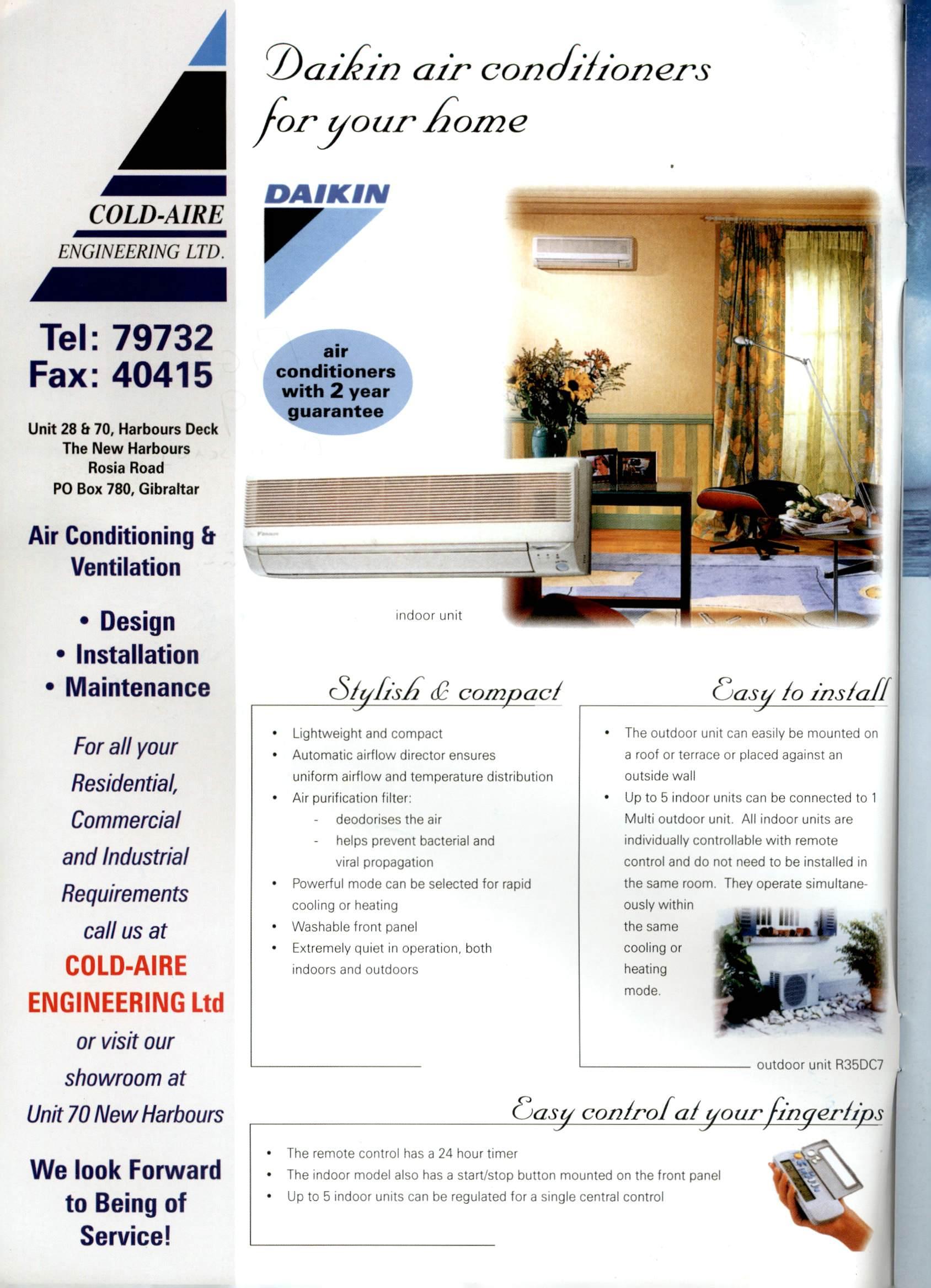 COLD-AIRE ENGINEERING LTD. Tel: 79732 Fax: 40415 Unit 28 b 70, Harbours Deck The New Harbours Rosia Road PO Box 780, Gibraltar Air Conditioning fr Ventilation • Design • installation • Maintenance For all your Residential, Commercial and Industrial Requirements call us at COLD-AIRE ENGINEERING Ltd or visit our showroom at Unit70New Harbours We look Forward to Being of Service!