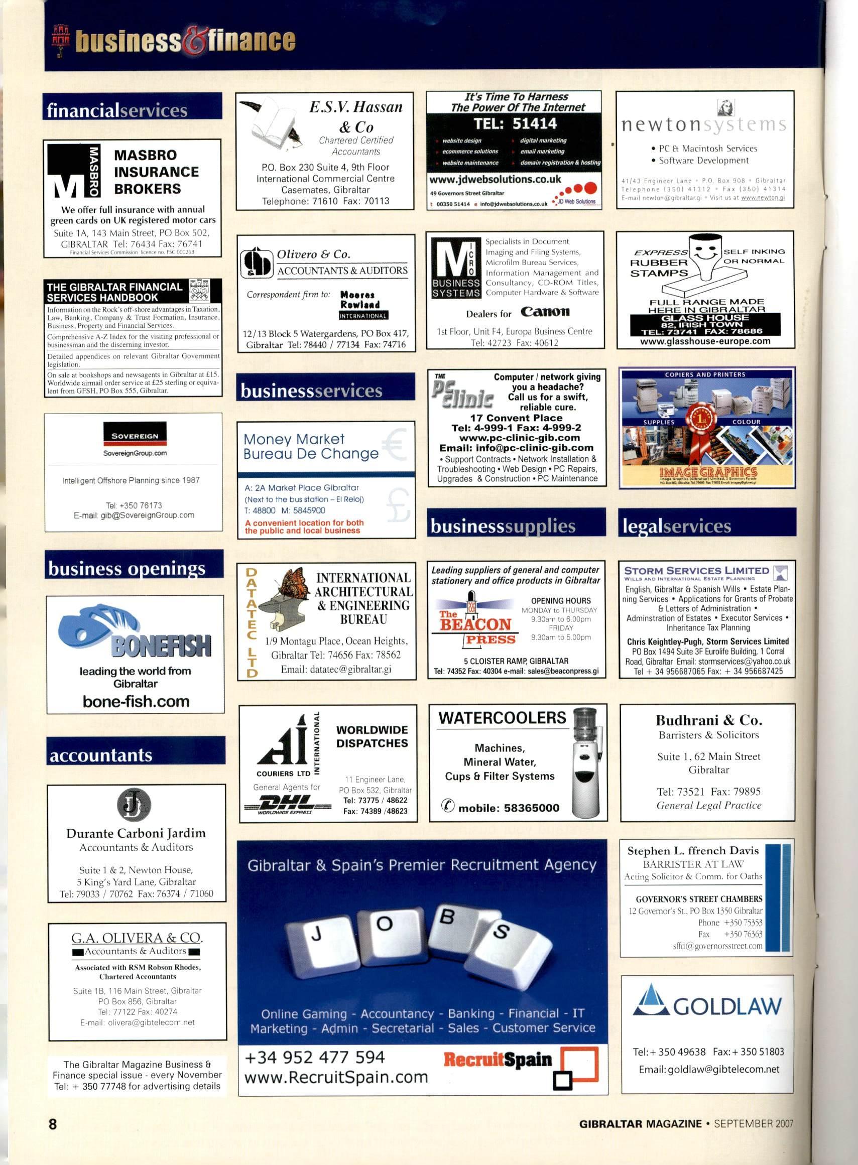 biisiness&finance financialservlces MASBRO INSURANCE BROKERS We offer full insurance with annual green cards on UK registered motor cars Suite 1A, 143 Main Street, PO Box 302, GIBRALTAR Tel: 76434 Fax: 76741 THE GIBRALTAR FINANCIAL SERVICES HANDBOOK Inlornraiioii en Ihe Kiitk's off--h(ire advaniaiies iiiTiixiilion Haiikiiii;. Cunipanv & Trust Foimaliim. Insurance Business. I'nipeny and t'inancial Sers'ices. ive A-Z Index for ihe visning prolcssiotial or and (he discerning investor. npreheii Detailed appendices on relevant Gibraltar Governnieni legislation. On sale at bookshops and nesvsajtents in Gibraltar at tl5. Worldwide airmail order seAnce at £25 sterling or equiva lent Irom OFSH.PO Box 555. Gibrailar. SovaagnGrocp.cent Intelligent Offstiore Planning since 1987 Tel 350 76173 E-mail gib^Soveret^iGrcH^ com business openings leading the world from Gibraltar bone-fish.com accountants Durante Carboni Jardim Accountants & Auditors Suite 1 & 2. Newton House, 5 King's Yard Lane, Gibraltar Tel: 79033 / 70762 Fax: 76374 / 71060 CA.Oy.TVERA&CO. ■Accountants & AuditorsM Associated with RSM Kohxon Rhodes, Chartered .Accountants Suite IB, 116 Main Street. Gibraltar PO Box 356, Gibraltar Tel 77122 Fax: 40274 E-mail, olivera@gibtelecom.n0t The Gibraltar Magazine Business & Finance special issue • every November Tel: + 350 77748 for advertising details E.S.V. Hassan ...A &Co Chartered Certified Accountants RO. Box 230 Suite 4, 9th Floor international Commercial Centre Casemates. Gibraltar Telephone: 71610 Fax: 70113 m OUvero & Co. ACCOUNTANTS & AUDITORS CoTres\>ondentfirm to: Moerct Rewised 12/13 Block 5 Watergardens, I'O Box 417, Gibraltar Tel: 78440 / 77134 Fax: 74716 businessservices Money Market Bureau De Change A: 2A Market Place Gibraltar (Next lo the bus station - El Relol) T: 48800 M: 5845900 A convenient location for both the public and local business INTERNATIONAL ARCHITECTURAL & ENGINEERING BUREAU 1/9 Montagu Place, Ocean Heights. Gibraltar Tel: 74656 Fax: 78562 Email: datatec@gibraltar.gi It's Time To Harness The Power Of The Internet TEL: 51414 awfVffvnMAv website maintenance domam registration & hotting www.jdwebsolutions.co.uk 49 Governon Smct Gibcahar 00350 514)4 e lftMidwebeolutieiis.eD.ulc JDWabSobbont newton PC ft Macintosh Services Software Development 4:/J3 [r.gmfft Lanf ° 0 6n. -lOfi niL-tdUarplpphonf .151) 4MI2 l4x I3E0I 413M i m.i.l n'-.vttiniaiyihf-Hot <ji VisM ws ncwlO" a Vi BUSINESS SYSTEMS Sperlalists in Dncument Imaging .4nil Filing SyslL-ms, Mil rofilm Bureau Services, Infiirnicitiiin Managemenl and Consullnnry. CO-ROM titles, C(ii>i|3uter I l.irdware iN Sultv.',iri' Dealers for Canon 1st Flour, Unit F4, Eiiropa Business Gentre Tel: 42723 Fax: 4(1612 EXnFieSS RUBBER STAMPS SELF INKING OF! NORMAL FULL RANGE MADE HERE IN GIDRALTAR www.glasshouse-europe.com Computer / network giving you a headache? Cali us for a swift, reiiabie cure. 17 Convent Place Tel: 4-999-1 Fax: 4-999-2 www.pc-ciinic-gib.com Email: info@pc-ciinic-gib.com • Support Contracts • Network Installation & Troubleshooting • Web Design ■ PC Repairs, Upgrades & Construction • PC Idaintenance COPIERS AND PRINTERS ][!»4IA\(5 businesssupplies 1 legalservices Leading suppliers ofgeneral and computer stationery and office products in Gibraltar The ,1 beAcon jPRESS OPENING HOURS P.'ONClAY to TH.RSDAY '? lO.jn-, to 6 OOpni FRIDAY 9 30a-ii |.;i5 00um 5 CLOISTER RAMP, GIBRALTAR Tel: 743S2Fax: 40304 e-mail: saleeiSbeamnpress.gi Storm Services Limited English, Gibraltar & Spanish Wills • Estate Plan ning Services * Applications for Grants of Probate & Letters of Administration • Adminstration of Estates • Executor Services inheritence Tax Planning Chris Kelgtitley-Pugh, Storm Services Limited PO Box 1494 Suite 3F Eurolife Building, 1 Corral Road, Gibraltar Email: stonnservices@vahoo.co.uk Tel -£ 34 956687065 Fax: + 34 956687425 1 i J ¥WORLDWIDE ^1 DISPATCHES COURIERS LTDbncinnor Lane. Grni^r i' A:V-1S ror PO Box 532. Gitrai';cii VSMMM Tel; 73775/ 48622 * Fax: 74389 /48623 WATERCOOLERS Machines, Mineral Water, Cups & Filter Systems 0 mobile: 58365000 Budhrani & Co. Barristers & Solicitors Suite 1, 62 Main Street Gibraltar Tel: 73521 Fax: 79895 General Legal Practice Gibraltar & Spain's Premier Recruitment Agency +34 952 477 594 www.RecruitSpain.com RecruitSpain Stephen L. ffrench Davis BARRISTER AT I-AW .Acting Solicitor &. Gomm, fur (lat)iGOVERNOR'S STREET CHAMBERS 12 Governor's St., PO Box 13511 Gibatlin Phone +350"S35i Fax +150"63^3 sffcKa'goveniorxMreet.cDiti GOLDLAW Tel:+35049638 Fax: +35051803 Email; goldlaw@gibtelecom.net GIBRALTAR MAGAZINE • SEPTEMBER 2007 L