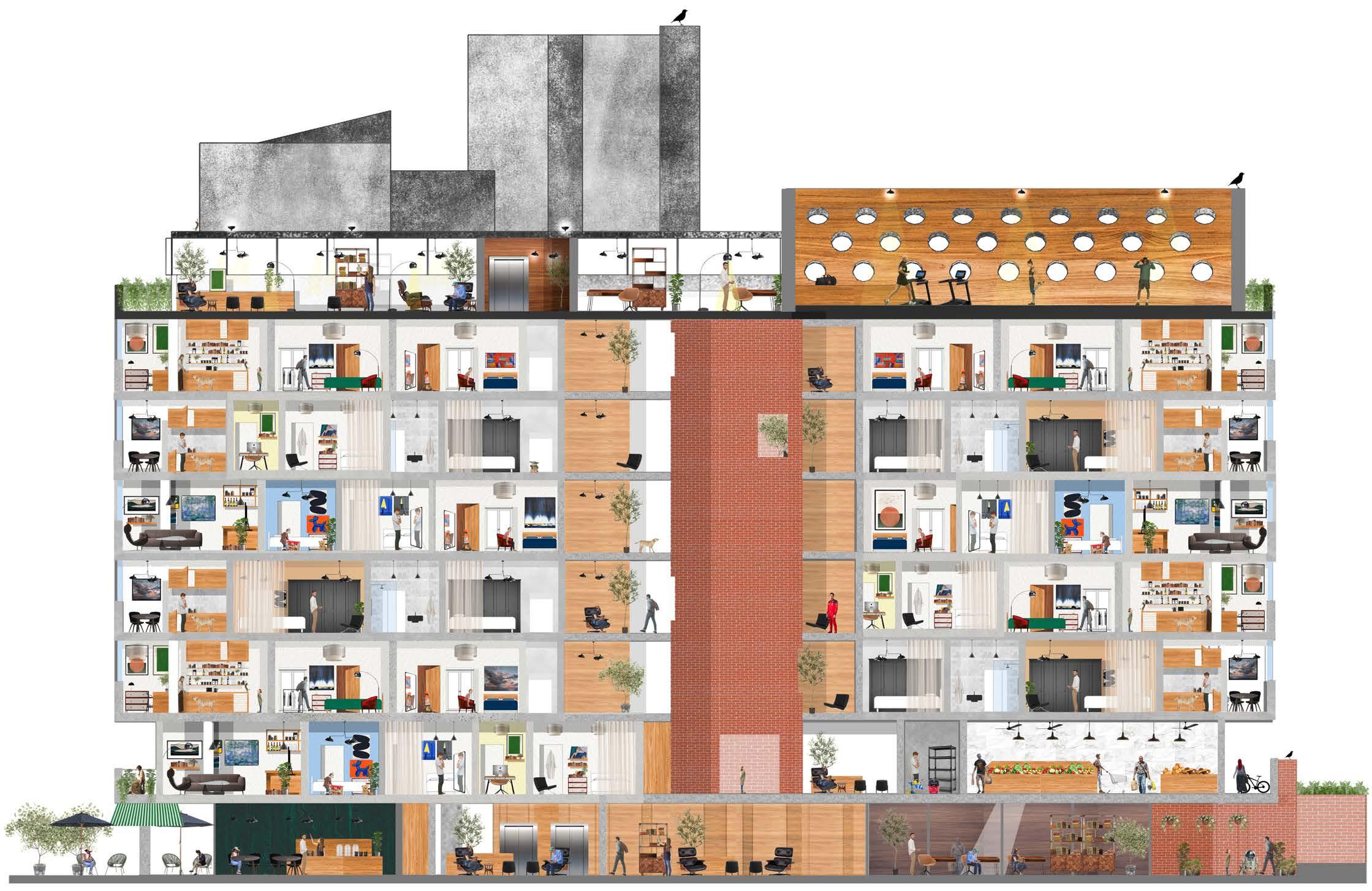 My ambition for the interior is to create generously size family homes, in a range of con c onfigurations that can be designed around the resident’s requirements. I also do not intend this project to be for one specific age or user type, rather a proposal that would work for all ages, backgrounds and people. My firm belief is that affordable housing should be available to all that need it.