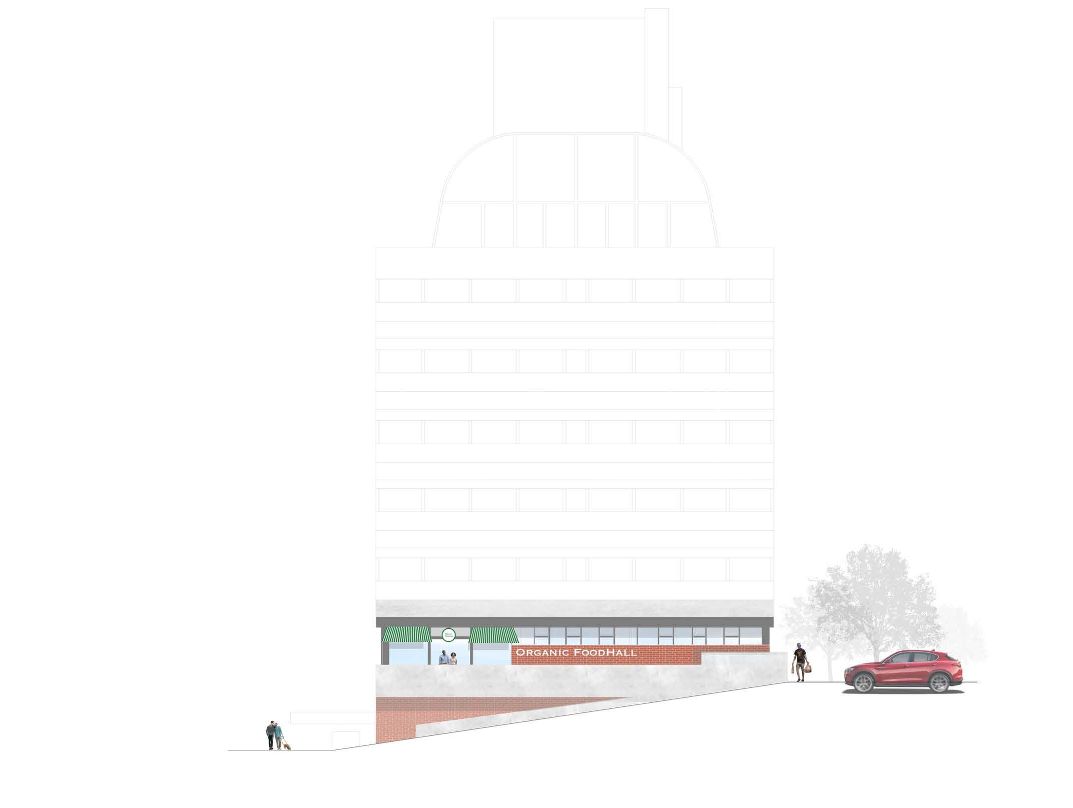 The store front is activated by large signage and owning. The space is accessed via College Way Path as the gradual incline leads to an entry point into the first floor.