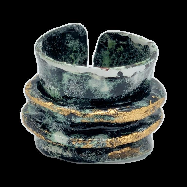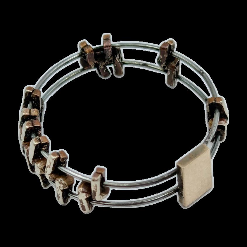 a pair of napkin rings in gilding metal, with hand printed cotton napkins