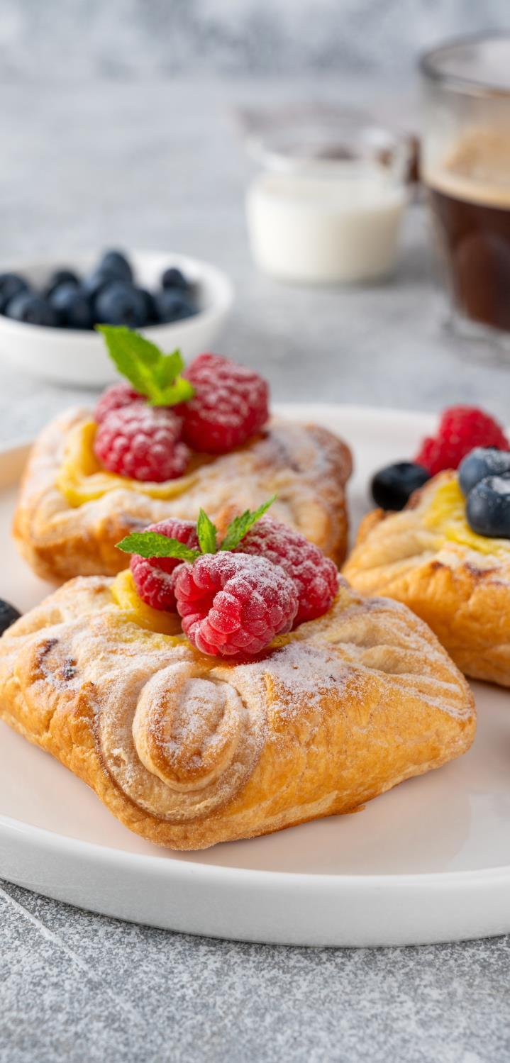 Chefs selection of freshly baked pastries: Pain au chocolate 353kcal | Pain au raisin 428 | Cinnamon bun 449kcal | Plain croissant 339kcal | Almond croissant 423kcal | Chocolate muffin 245 kcal|