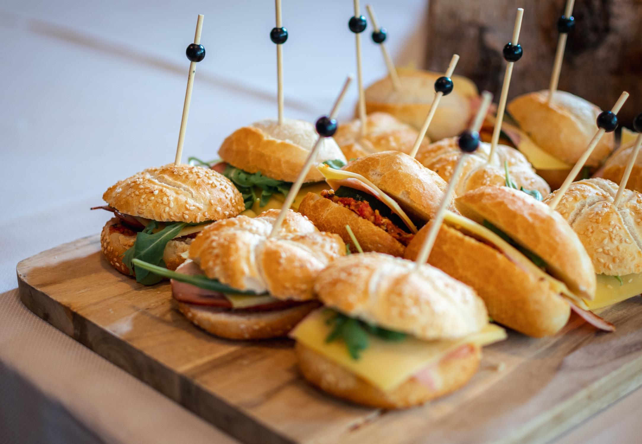 A selection of freshly prepared sandwiches with cheese board, fruits, snacks, crudites and dips