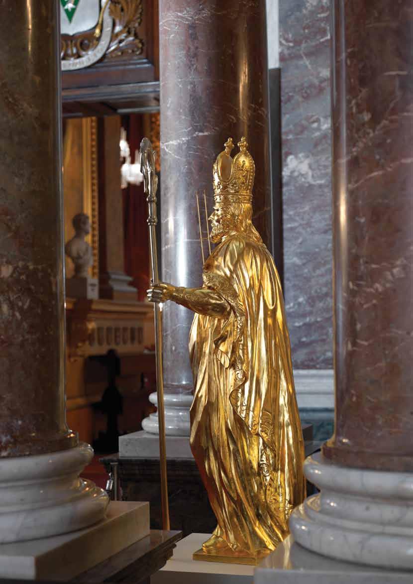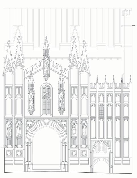 elaborate double porch facing onto Guildhall yard. The present facade was designed by George Dance in 1788 in his famous ‘hindoo-gothic’ style – Croxtone’s porch being so decayed that its facade had to be removed. Six of the original statues, which occupied niches in the porch, had survived in situ into the eighteenth century. Four of these were sold and ended up in a stable yard in north Wales from where they were recovered in 1972. They are now in the Museum of London.