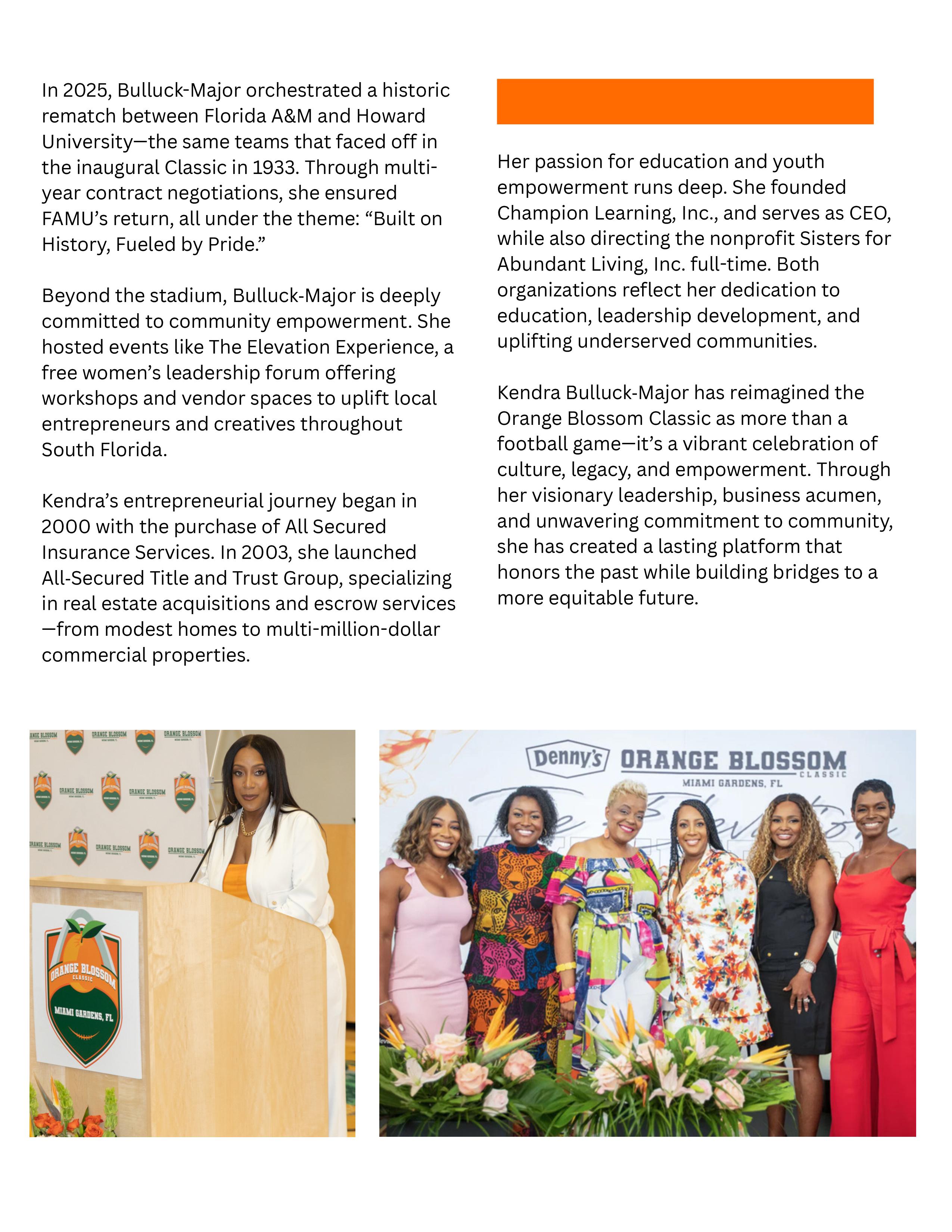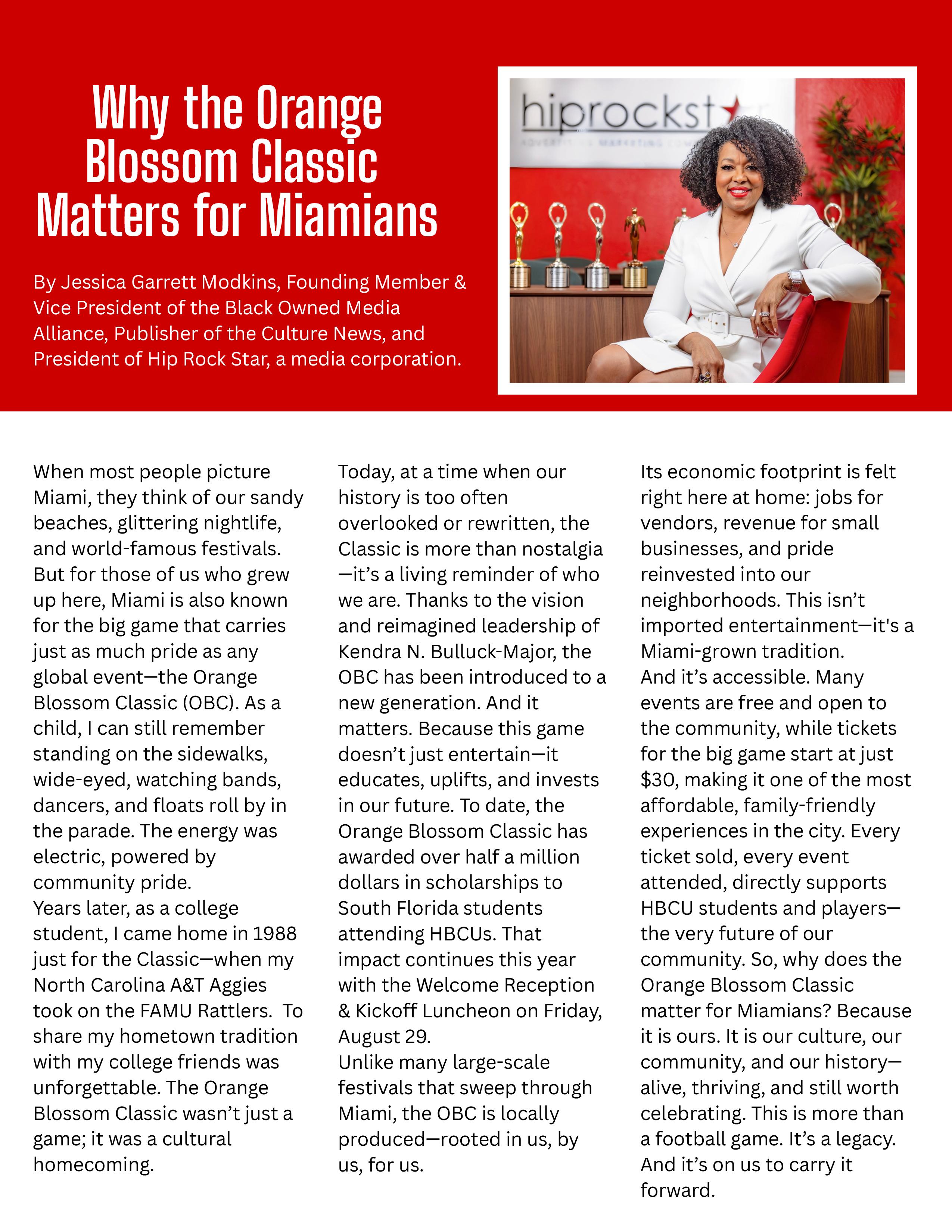 The Classic Times Magazine is a commemorative publication celebrating the culture, pride, and legacy of HBCUs through the lens of the Orange Blossom Classic and beyond. With stories that highlight alumni achievements, community impact, and the transformative power of higher education, the magazine serves as both a tribute to tradition and a spotlight on progress. The Classic Times honors the past, celebrates the present, and inspires future generations to carry forward the excellence of HBCUs.
