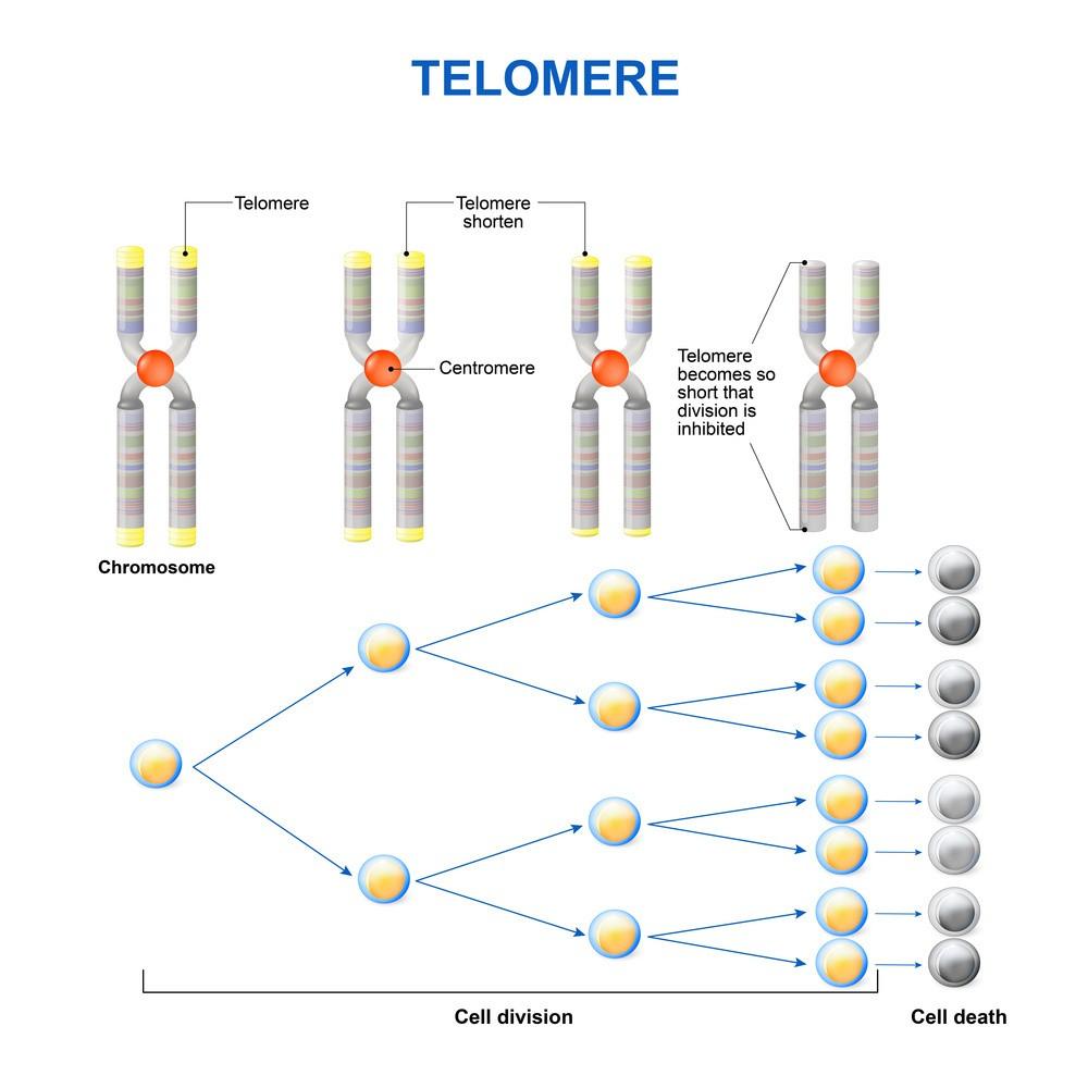 Telomeres are the protective caps on the ends of chromosomes and as all cells replicate and age, the telomeres get shorter. Cells with short telomeres lose function and die – this is an essential part of the ageing process on a cellular level.