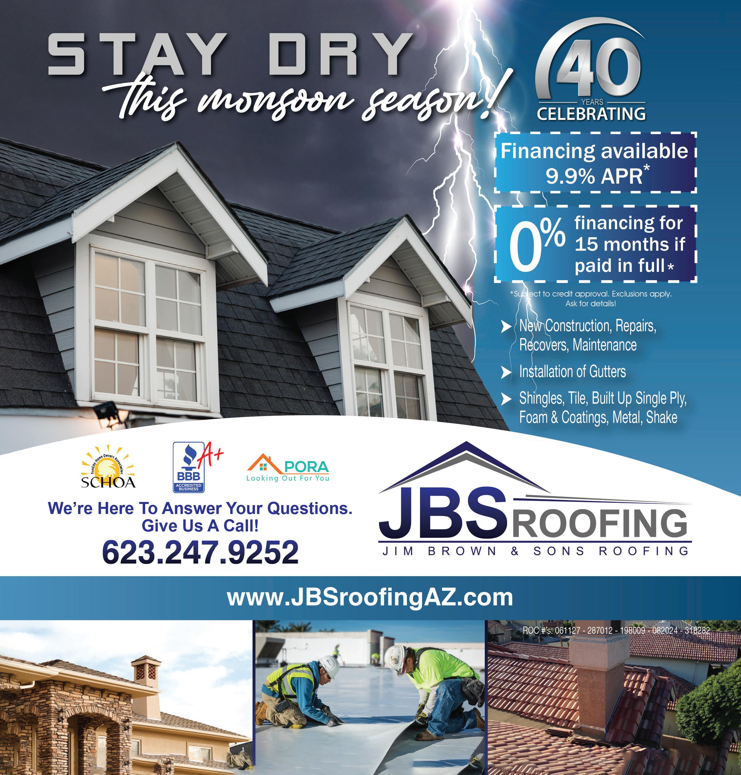 SEPTEMBER 2023 • THE GRAND SEASON 33 FOR ADVERTISING INFORMATION CALL (623) 594-1630 CONCRETE COATINGS Call 623-853-9051 Simulated CoolDeck Simulated Flagstone Tuscany Stain SOLID COLOR Polyurethane with Fleck System $349 Per Sq. Ft. Not valid with any other discounts. Offer expires 10/15/23 We use two-components, solvent, polyurethane UV, absorbers – NOT single-component acrylic. GARAGES • PATIOS • DRIVEWAYS AZ ROC Lic #203136 www.TheDesertRose.com Starting at Call for a FREE Roof Inspection! Don’t hire a storm chaser... We’re EXPERTS in: Tile & Shingle Re-Roofing Roof Replacement • Roof Repair Roof Maintenance • Roof Inspection Rain Gutters-Repair and Replacement Your roof is one of the most important components of your home. If your roof is over 10 years old, if it has multiple layers or missing shingles or tiles, if there is physical damage, or if you have leaks it’s time to call Sun City Roofing! ROC #281375 623-340-9866 www.SunCityRoofingAZ.com CALL TODAY! For a FREE Estimate CALL TODAY! For a FREE Estimate $300 Discount on Full Roof Replacement With this coupon. PEORIA 19027 N. 83RD AVE 623-440-2666 GILBERT 2720 S. MARKET ST 480-534-7127 3 HUGE SHOWROOMS OPEN TO THE PUBLIC WITH 20+ MODELS ON DISPLAY, YOU CAN BUY TODAY AND ENJOY TOMORROW! CUSTOM MODELS ON SALE READY WITH IMMEDIATE DELIVERY! FIRE PITS • FIREPLACES • ACCESSORIES • PATIO FURNITURE • PATIO COVERS CUSTOM OUTDOOR KITCHENS PHOENIX 21041 N. CAVE CREEK RD 602-877-2005