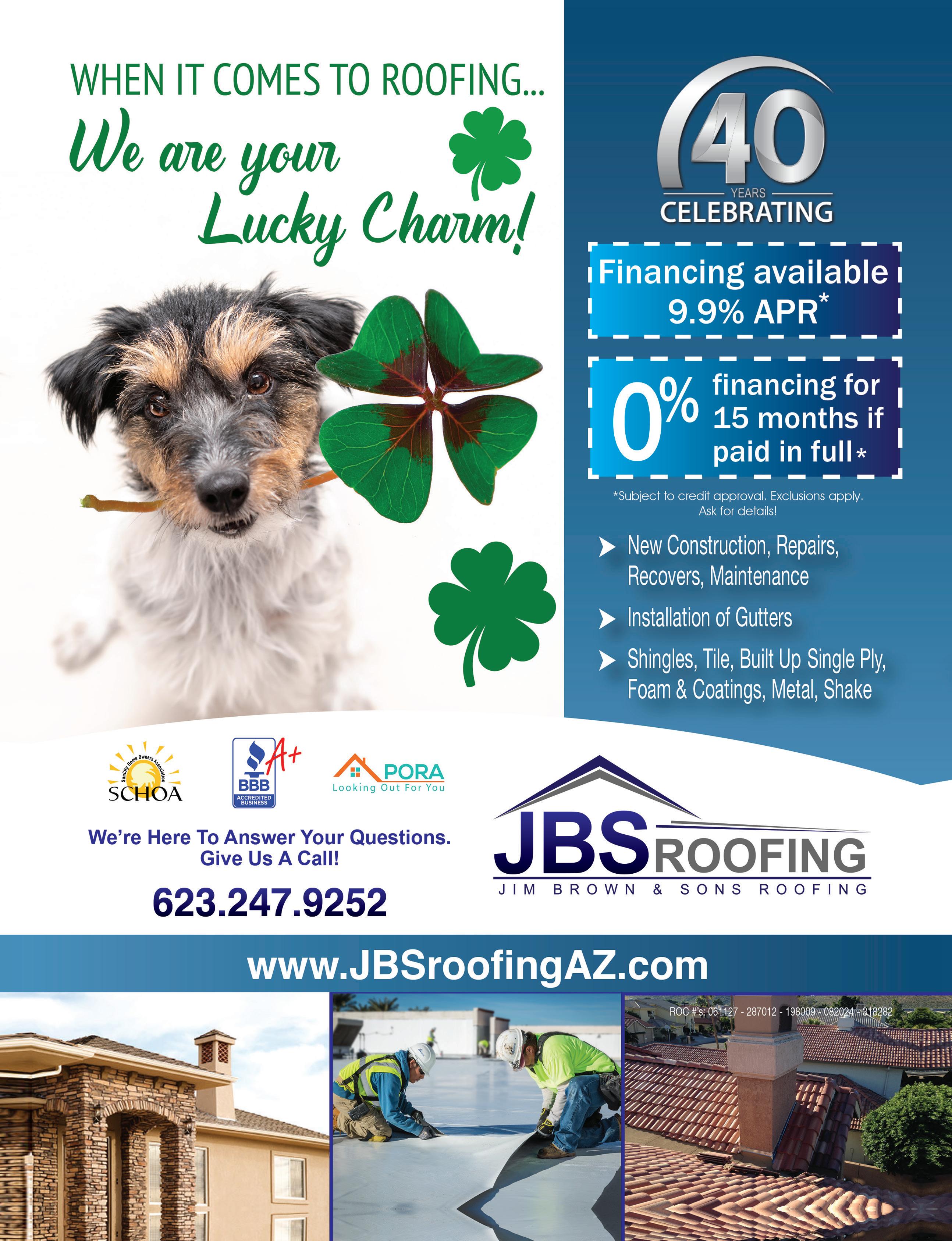MARCH 2023 • THE GRAND SEASON 43 ROC# 319848 CALL US AT 623-206-7317 Kitchens & Baths Media Walls & Flooring Showers & Countertops REMODELING JBSroofingAZ.com New Construction Repairs Recovers Maintenance 623.247.9252 Give Us A Call! RESIDENTIAL & COMMERCIAL ROOFING 14537 W Grand Ave Suite No.130 Surprise, AZ 85374 (623) 584-0474 www.albaremodeling.com Lic# KB-01 Roc#206312 Simply the Best REMODELING/CONSTRUCTION SCREENS & AWNINGS www.LibertyAwningsandShades.com ROC179338 602-956-1642 623-340-9866 www.SunCityRoofingAZ.com Located at 11201 W. Nevada Ave., Youngtown AZ Time for a new roof? Call for a FREE Estimate ROC #281375 FREE Warranty Program • FREE Roof Inspection! ROOFING REMODELING SPARKS HOME IMPROVEMENTS Specializing in Kitchen, Bath & Home Remodeling 623.363.5557 Call for a FREE ESTIMATE ROC 327850 REMODELING REMODELING 623-214-3599 BRING YOUR VISION TO LIFE! Custom Kitchen & Bath Flooring & Walk in Shower Design & Consultation POOL CLEANING CHEMICALS INCLUDED NO CONTRACTS WEEKLY CLEANING $125 PER MONTH OTTER POOL CLEANING, LLC 480-547-5849 WWW.OTTERPOOLCLEANING.COM ROC #310824 • 0% INTEREST OAC 623-887-0053 330 S. 75th Ave • Phoenix FREE ON-LINE QUOTES VISIT OUR WEBSITE PREMIUM WINDOWS MAXIMUM HEAT REFLECTION & DUST CONTROL FACTORY SHOW ROOM MON-FRI 9AM-5PM EnergyShieldWindowsAndDoors.com WINDOWS & DOORS ADVERTISE HERE! Tens of Thousands of Readers will see your business for $150/month or less! 623-594-1630 10404 W. Coggins #101, Sun City WEEDS - WEEDS - WEEDS LIC E NS E #9 00 2 STARTING AT $99 PREEMERGENT TREATMENT YourWEEDGUY.com TRIDE PEST TRUE AND •WEEDS•TERMITES 623-518-4527 PEST AND TE RM ITE C O N T R OL, LL C WEED CONTROL WEED CONTROL GOT WEEDS? www snydersweedcontrol com 623-435-2208 AZ Lic #C5633 Ask About Our Discounts 602.770.5762 · INSTALLS · REPAIRS · BROKEN WATER LINES · VALVE REPLACEMENT · TIMER PROGRAMING allaffordablesprinklerrepair.com 20 Years Experience All Affordable Sprinkler Repair SPRINKLERS FINE ART wholesalers Since 1966 View 350 Original OIL PAINTINGS SCW 760.898.1675 Call to view Save up to 70% WALL ART / FINE OIL PAINTINGS