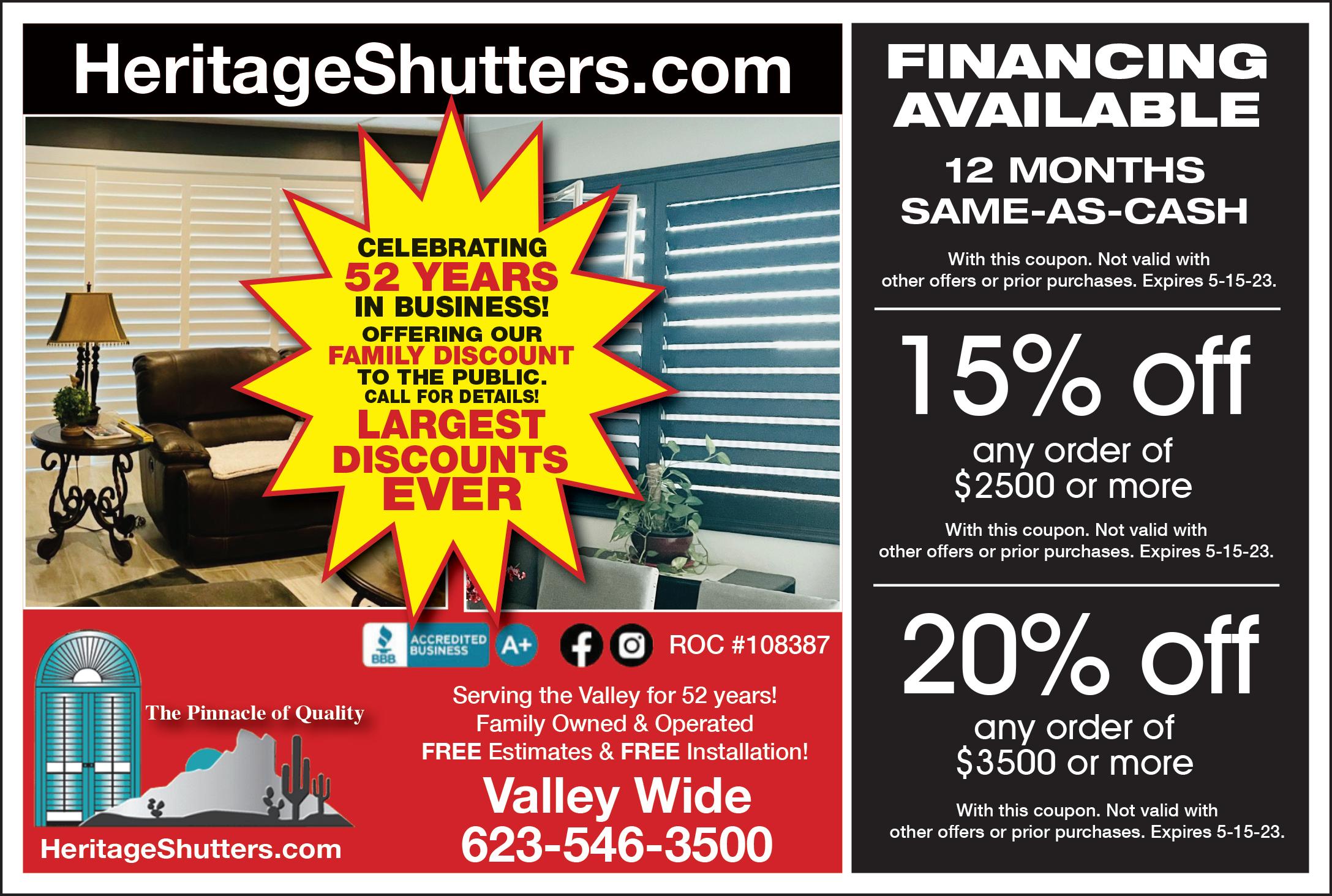 30 THE GRAND SEASON • APRIL 2023 WWW.THEGRANDSEASON.COM SUN DEVIL HEATING & COOLING ARIZONA’S BEST QUALITY AT THE COOLEST PRICES ANY NEW INSTALL $500 OFF Some restrictions apply. Call for details Exp 5/31/23 SUNDEVILAZ.COM •ROC #237769602-466-1932 Some restrictions apply Call for details Exp FREE SERVICE CALL WITH REPAIR ($98 VALUE) 5/31/23 Some restrictions apply Call for details Exp Financing 0% 5/31/23 Family Owned & Operated A+ Rating with BBB ZERO complaints with the ROC Free Estimate for New Units