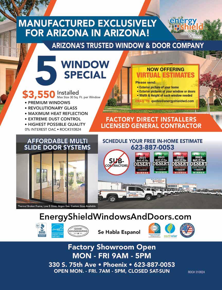 20 THE GRAND SEASON • JANUARY 2023 WWW.THEGRANDSEASON.COM Call or Text for a FREE ESTIMATE 623-810-BATH (2284) www.SilveradoBathandRemodel.com START FRESH! TRANSFORM YOUR BATHROOM TODAY! TRULY ONE OF A KIND CALL TO VISIT OUR SHOWROOM 8550 N. 91st Ave., #62 Peoria, AZ 85345 WE OFFER VETERANS DISCOUNTS! Must present coupon. Not to be combined with other offers. Offer expires 2/15/23. $500 OFF ANY COMPLETE SHOWER ENCLOSURE ·SOLID SURFACE SHOWERS & VANITIES ·ADA COMPLIANT ·GRAB BARS · FRAMELESS OR FRAMED GLASS ENCLOSURES ·CUSTOM SHOWER PANS & WALL SURROUNDS AZ ROC Lic.# 322330, 322331, 322332