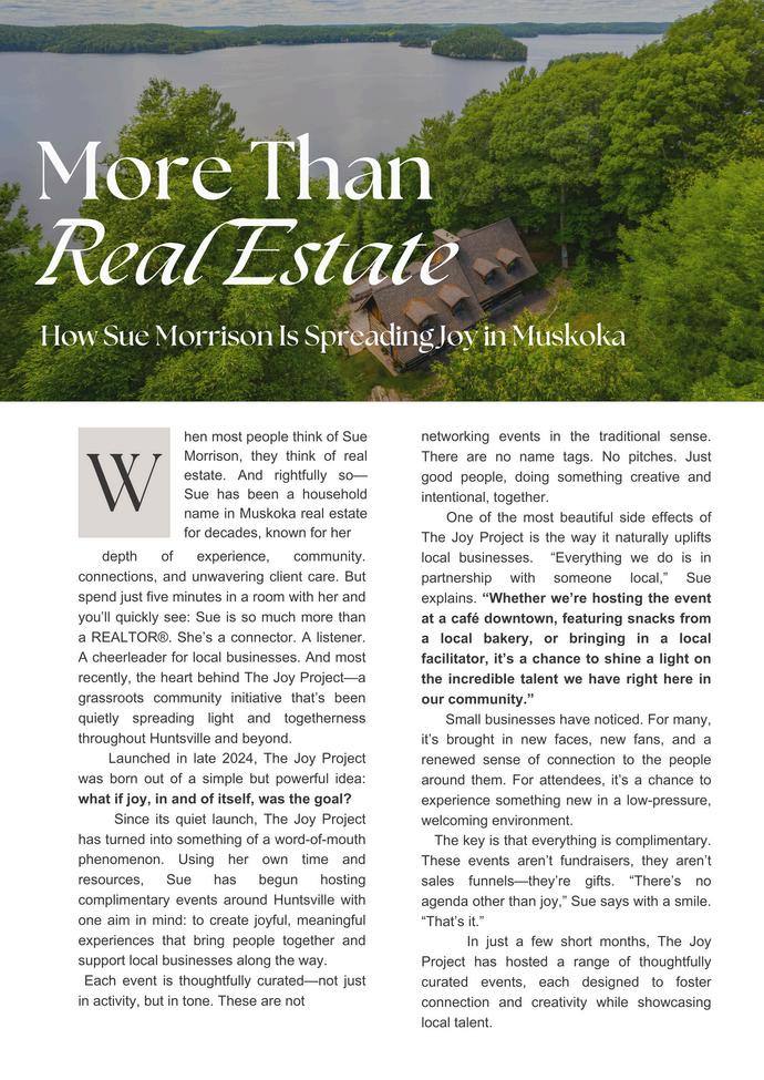 Titled “More Than Real Estate: How Sue Morrison Is Spreading Joy in Muskoka,” this piece goes beyond the listings and luxuryspotlighting Sue’s passion for people, her deep community roots, and her heart-led initiative: The Joy Project.