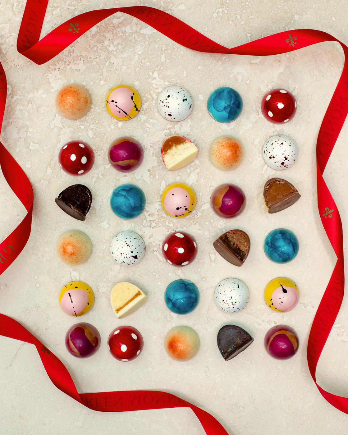 Our festive mendiant collection, featuring swirls of peppermintinfused white and dark chocolate. Each piece is elegantly topped with crunchy candy cane bits, adding the perfect holiday crunch to this timeless treat.