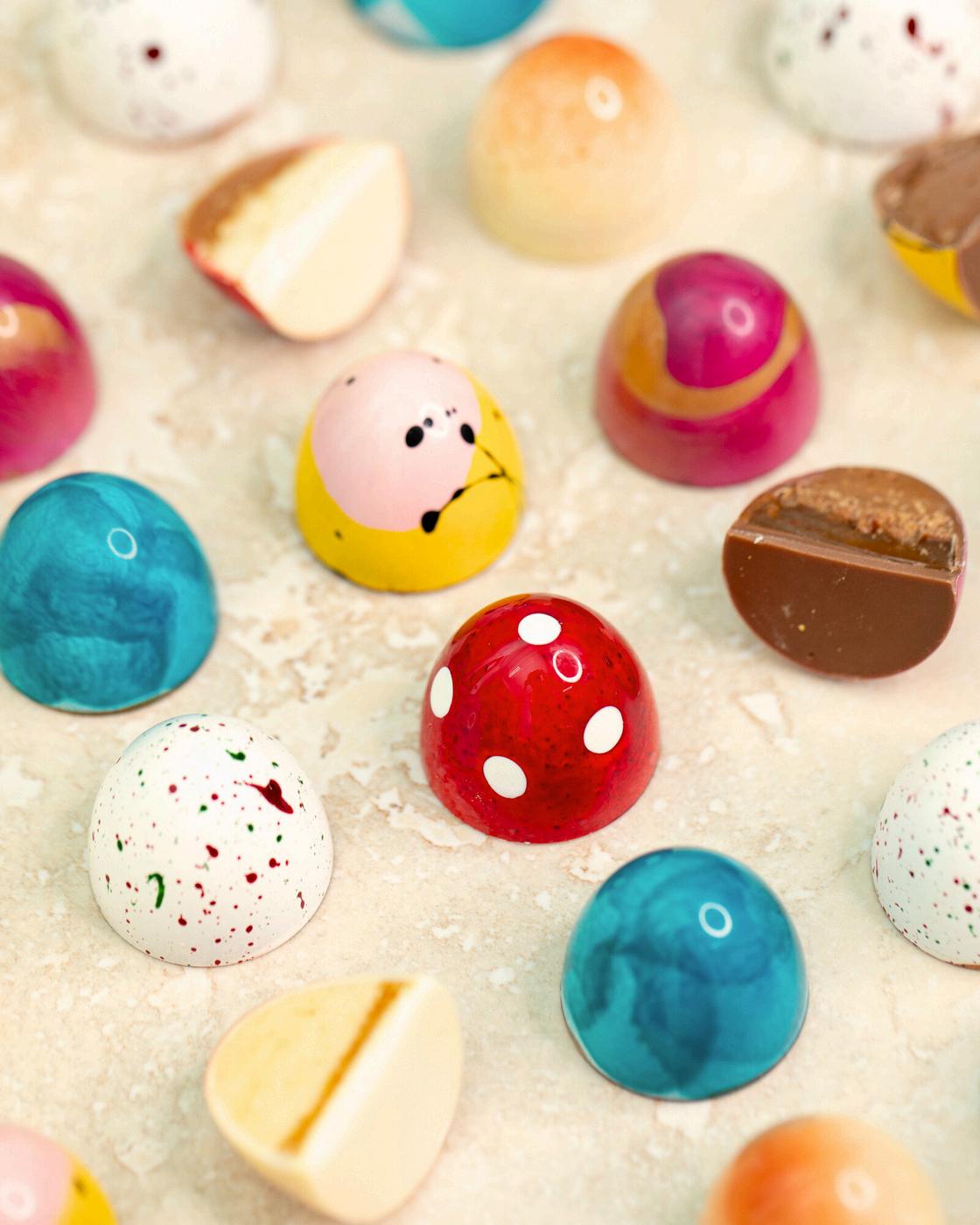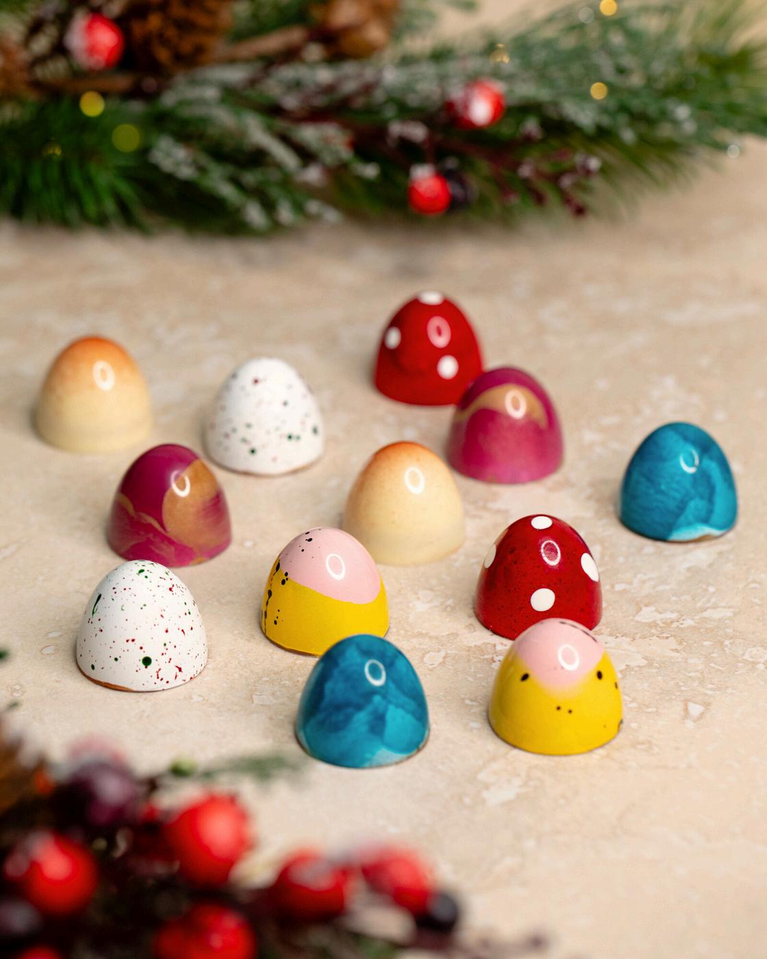 Our festive mendiant collection, featuring swirls of peppermintinfused white and dark chocolate. Each piece is elegantly topped with crunchy candy cane bits, adding the perfect holiday crunch to this timeless treat.