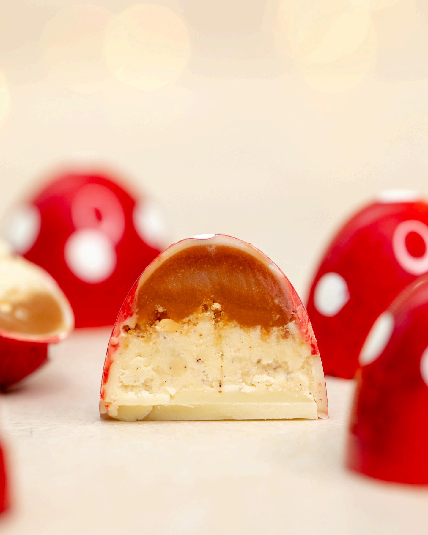 Aluxuriouswhite chocolateandbutter vanillabeanganache, andlayeredwitha delicatecaramelized sugarcrisp