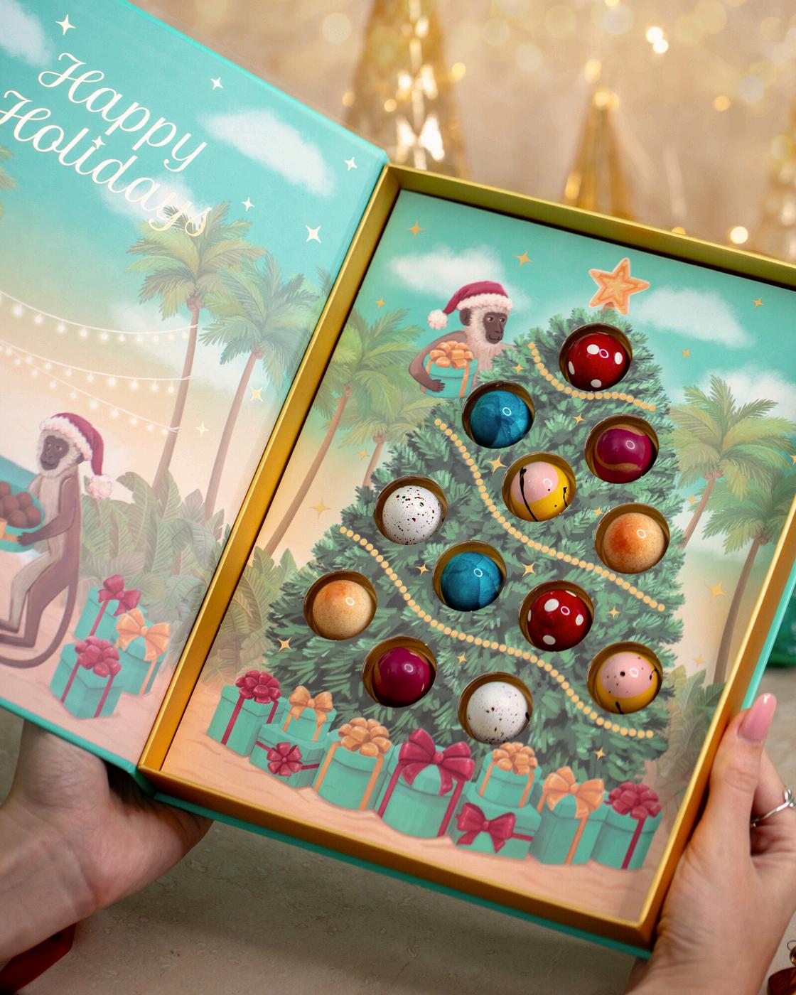 A gift that feels like opening a holiday story. Lift the cove musicstorybookandthescenecomestolife-aChristmastree with12jewel-likechocolatetruffles,eachgleaminglikeanor Insideawait2ofeachofourlimited-editionfestiveflavours exclusivelyfortheseason.