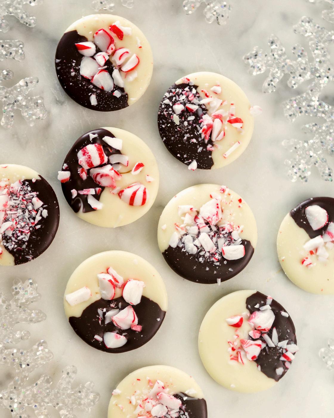 Our festive mendiant collection, featuring swirls of peppermint-infused white and dark chocolate. Each piece is elegantly topped with crunchy candy cane bits, adding the perfect holiday crunch to this timeless treat.