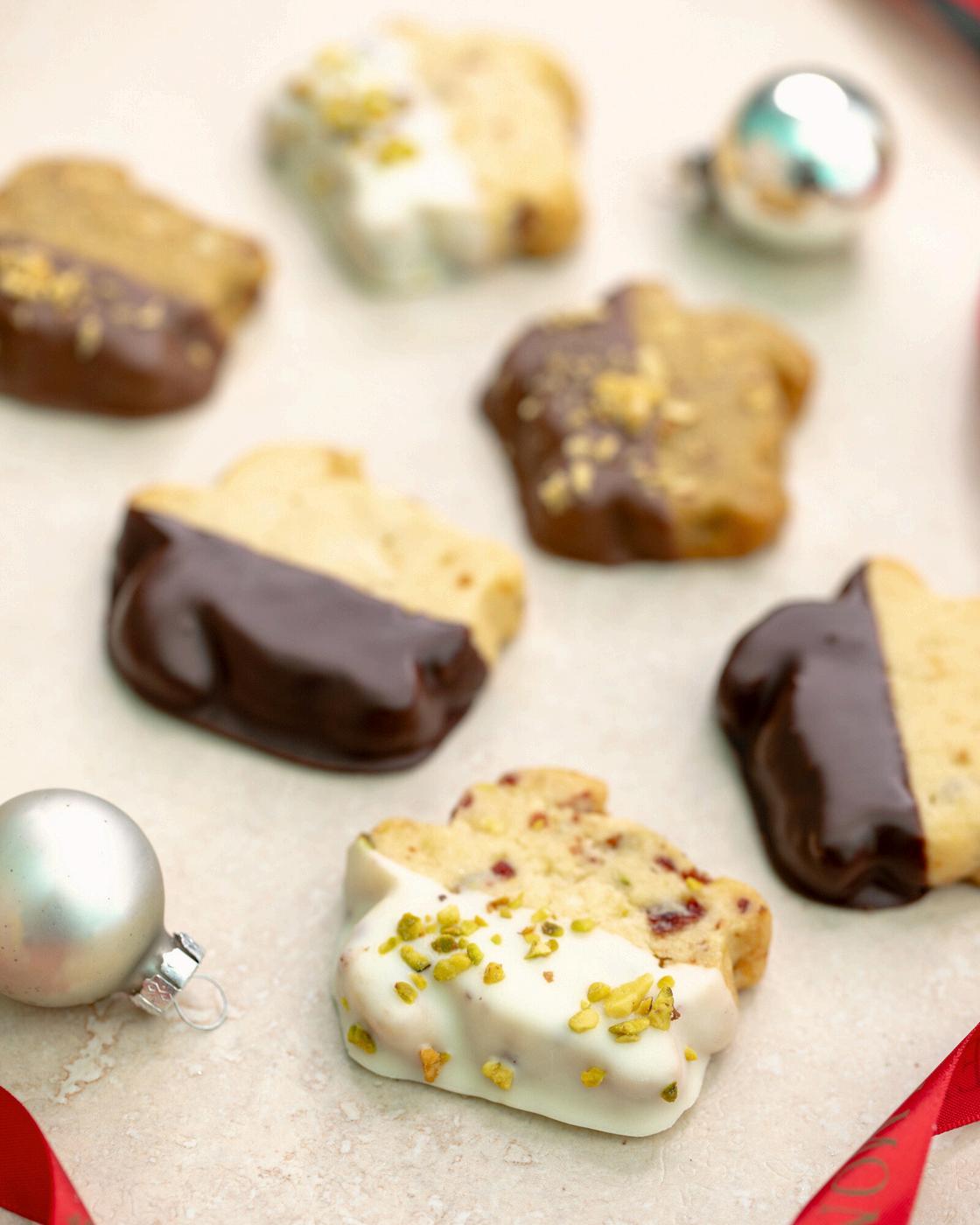 White Chocolate Cranberry Pistachio - White chocolate shortbread with festive tart dried cranberries, dipped in a white chocolate glaze toppedwithtoastedpistachionuts.