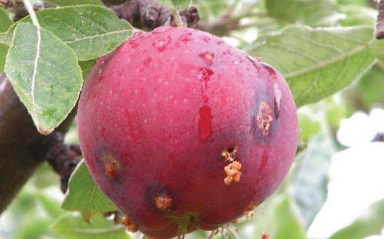 Here’s one example of the insect challenges that apple growers face. This apple show the signs and symptoms of a codling moth larvae infestation.