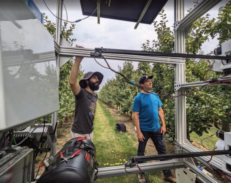 Gerbe Botden, (R) and Mike Giannikouris inspect orchard progress in robotic apple thinning, Blue Mountain Fruit Farm, Thornbury, Ontario.