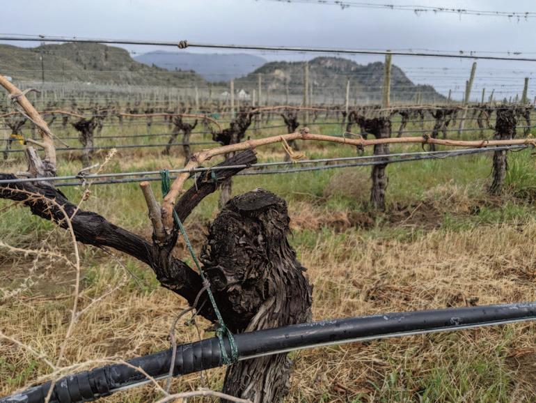 Grape vineyards suffered equally devastating effects with primary and secondary buds showing no signs of life in this April 27, 2024 photo taken south of Oliver, BC.