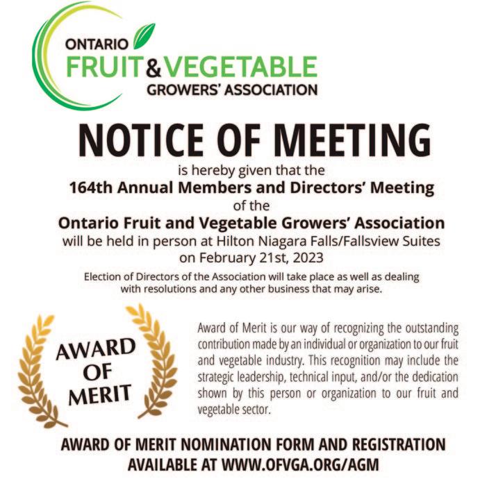 is hereby given that the 166TH Annual Members and Directors’ Meeting of the Ontario Fruit and Vegetable Growers’ Association will be held in person at Hilton Niagara Falls/Fallsview Hotel & Suites on February 18th, 2025
