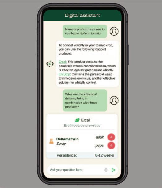 New features of the renewed Side Effects app include Koppert’s Digital Assistant, making the Side Effects app the first of Koppert’s digital tools to feature this cutting-edge AI tool. The new Digital Assistant feature on the app won the international GreenTech concept award in June for its potential to contribute to advancing sustainable agriculture. Now, the Digital Assistant is ready for its first commercial use, enabling growers to access information through the app’s standard search functionality or by asking the Digital Assistant for