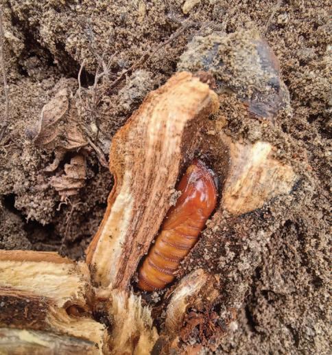 two-year life cycle protected within the plant, feeding on the crown, at the base of the canes, and on larger roots. They are protected from insecticides over most of that period. The longer a field is in production, the higher the risk, especially if the pest is not well-managed.