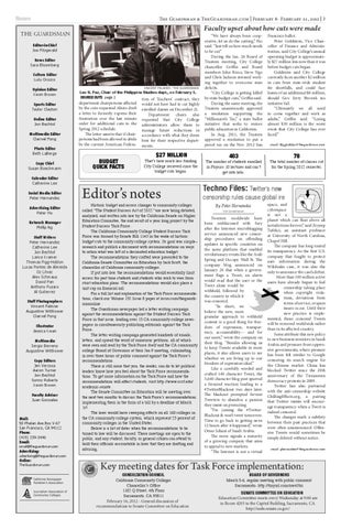 “We have always been cooperative, let us do the cutting,” Paz said. “Just tell us how much needs to be cut.” During the Jan. 26 Board of Trustees meeting, City College chancellor Griffin and Board members John Rizzo, Steve Ngo and Chris Jackson stressed working together to overcome state deficits. VINCENT PALMIER / THE GUARDSMAN Leo S. Paz, Chair of the Philippine Studies dept., on February 5. “City College is getting killed COURSE CUTS page 1 by state budget cuts,” Griffin said. tion of Teachers’ contract, they department chairpersons affected would not have had to cut highly During the same meeting, the by the cuts requested Alioto draft enrolled classes on December 21. Trustees unanimously approved a letter to formerly express their Department chairs also a resolution supporting the frustration over the last minute requested that City College “Millionaire’s Tax,” a state ballot order for additional cuts to the administrators allow them to initiative that seeks to restore Spring 2012 schedule. manage future reductions in public education in California. The letter asserts that if chair- accordance with what they deem In Aug. 2011, the Trustees persons had been allowed to abide best for their respective depart- approved a resolution to put a by the current American Federa- ments. parcel tax on the Nov. 2012 San