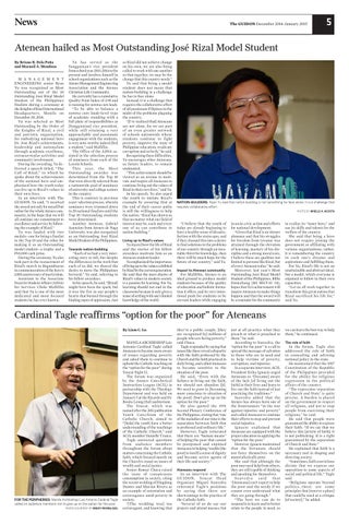 Yu has served as the Sanggunian’s vice president from school year 2013-2014 to the present and involves himself in school organizations such as the Ateneo Management Engineering Association and the Ateneo Christian Life Community. He currently has a cumulative Quality Point Index of 3.98 and is running for summa cum laude. “To be able to balance a summa cum laude-level type of academic standing with a full plate of responsibilities as [Sanggunian] vice president, while still retaining a very approachable and passionate engagement with the students, is very note-worthy indeed [for] a student,” said Mallillin. The Office of the ADSA assisted in the selection process of nominees from each of the Loyola Schools. Th is yea r, t he Most Outstanding awardee was determined from the Top 10 that were directly selected from a nationwide pool of nominees of university and college seniors in the country. This is contrary to previous years’ selection process, wherein nominees were trimmed down to 20 national finalists until the Top 10 Outstanding students were determined. Another Atenean, Gabriel Asuncion from Ateneo de Naga University, was also recognized as an Outstanding José Rizal Model Student of the Philippines. Towards nation-building