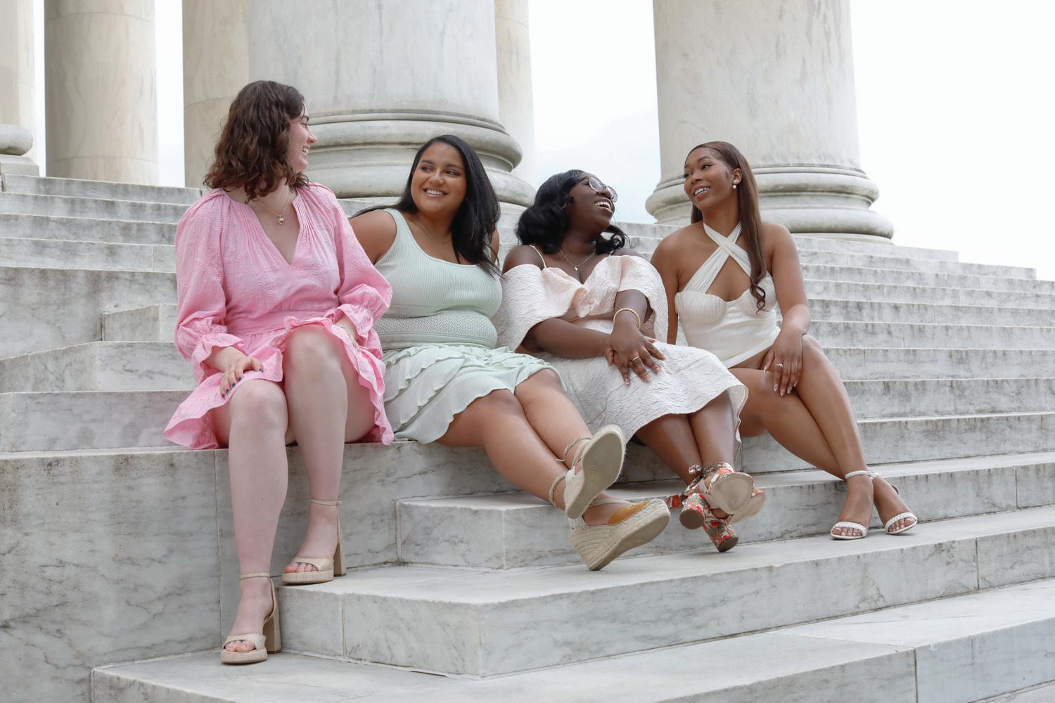 A student photographer takes a graduating student’s portrait at the Lincoln Memorial Reflecting Pool.