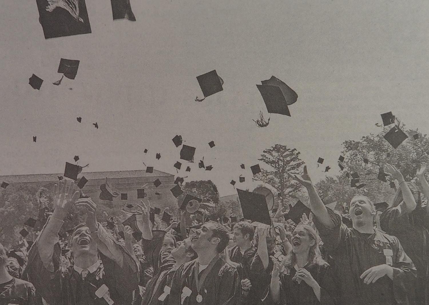 Facing a downpour, graduates gather to watch the weather report during Commencement in 1995.