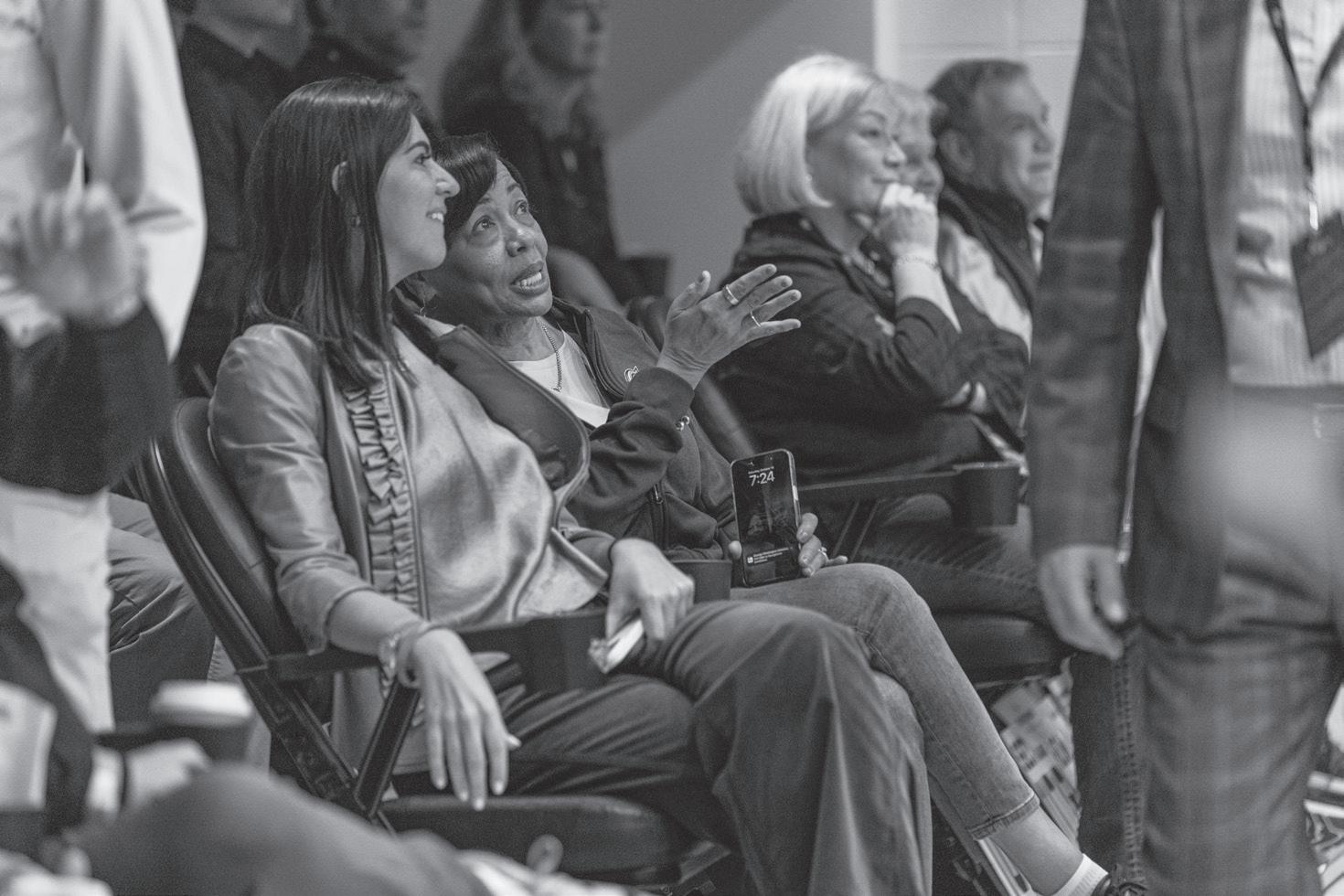 Ward 2 Councilmember Brooke Pinto and Board of Trustees Chair Grace Speights watch the men’s basketball game against Georgetown University on Saturday.