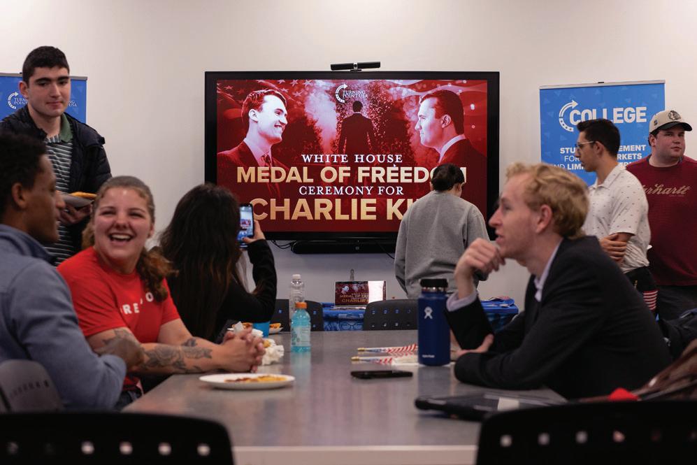 Turning Point Foggy Bottom members gather to watch the Medal of Freedom ceremony for Charlie Kirk Tuesday.