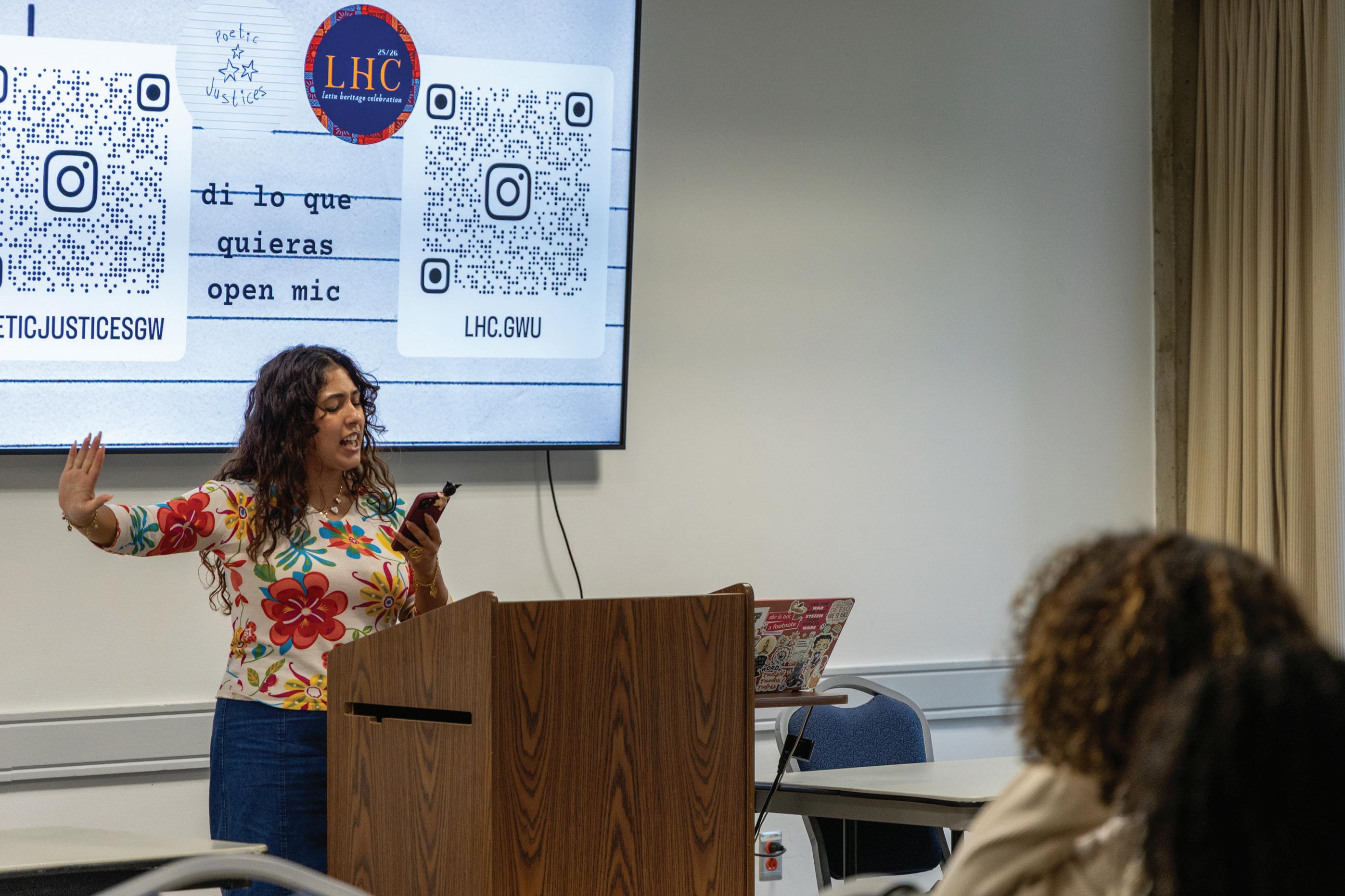 GW Poetic Justices, a student organization that brings awareness to social justice issues through poetry, collaborated this year with the student committee that organizes Latin Heritage Celebration, an annual month of programming at GW aiming to promote the values and traditions of South and Central America, the Caribbean and Spanish cultures, through a poetry reading called “Di Lo Que Quieras,” or “Say What You Want.” About 20 students gathered in a room in the University Student Center to listen to student poets read their work, which centered around their Latin identities — growing into them and navigating them through current political actions and rhetoric by President Donald Trump’s administration toward Latin and Hispanic communities.