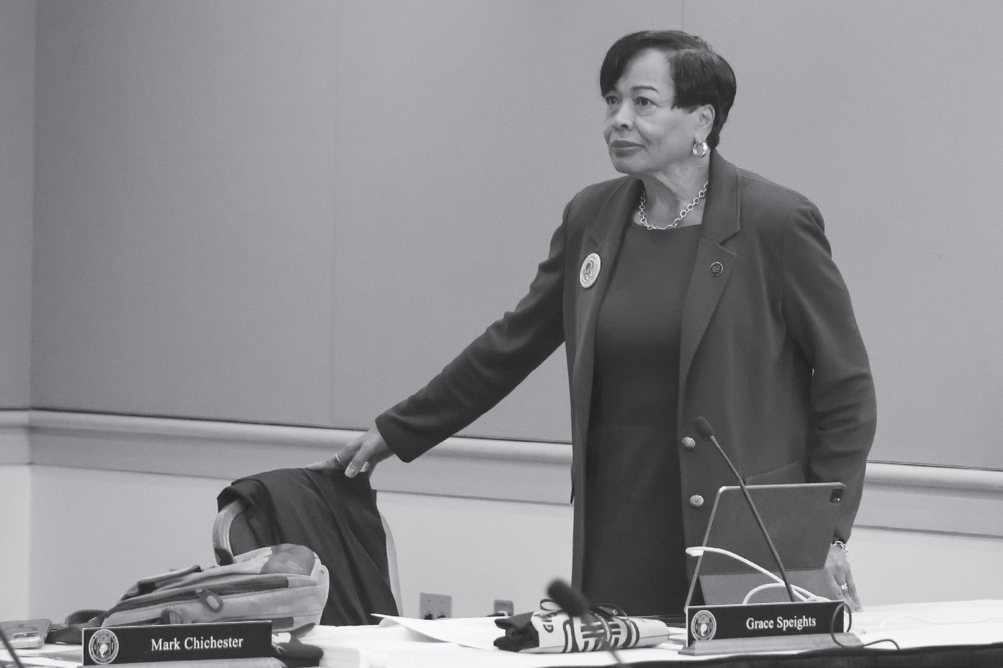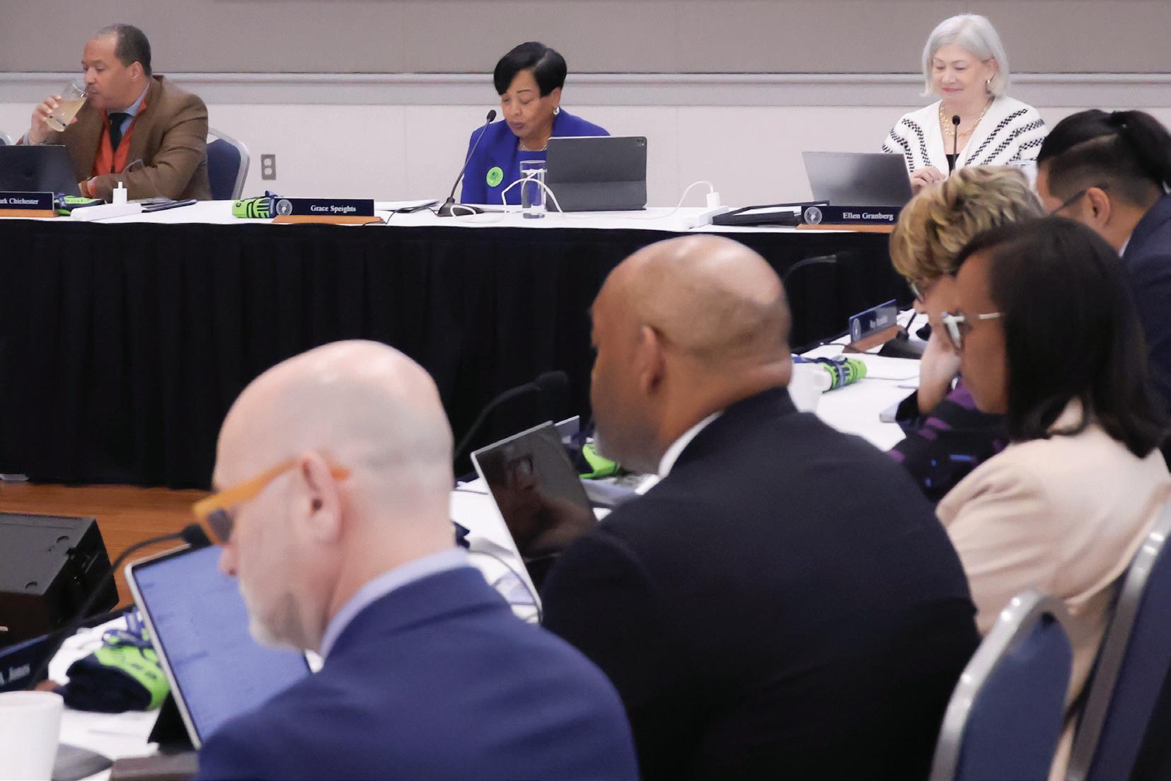 University President Ellen Granberg and Board of Trustees Chair Grace Speights sit at Friday’s meeting.