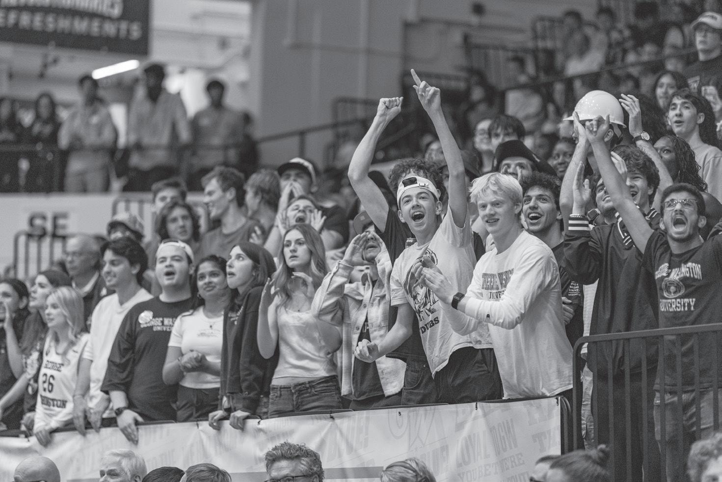 Students began leading chants for defense, stomping their feet in the stands and cheering each time the Revs sank a 3-pointer. Some students were wearing GW-branded tricorne hats, and more than one donned a full George Washington costume.