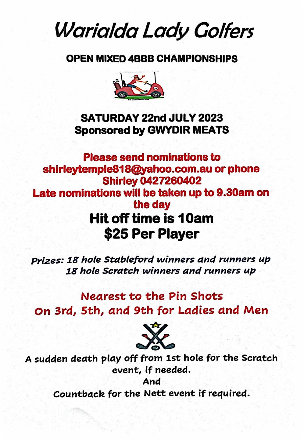 22nd Warialda Lady Golfers open mixed 4BBB Championships, from 10am. Contact Shirley Temple 0427 260 402.