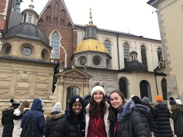 ABOVE: Hillard directs the choir during the first inauguration of Gov Henry McMaster in 2019 MIDDLE: The choir prepares to sing the national anthem at a Columbia Fireflies game in 2018 BELOW: Then-choir members Brianca Beckford ‘19, Justice Myers ‘19, and Anna Grace Felber ‘19 during the 2018-19 tour of Poland and the Czech Republic Photo credit to Hammond School (Instagram, Hammond School)